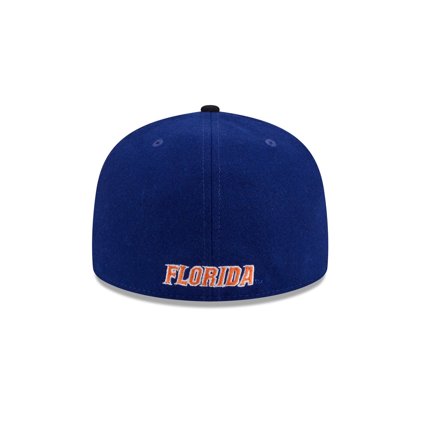 The Florida Gators Melton Wool 59FIFTY Fitted Cap features a chenille applique Gators logo patch at the front panels with an embroidered team wordmark at the rear and a gray undervisor.