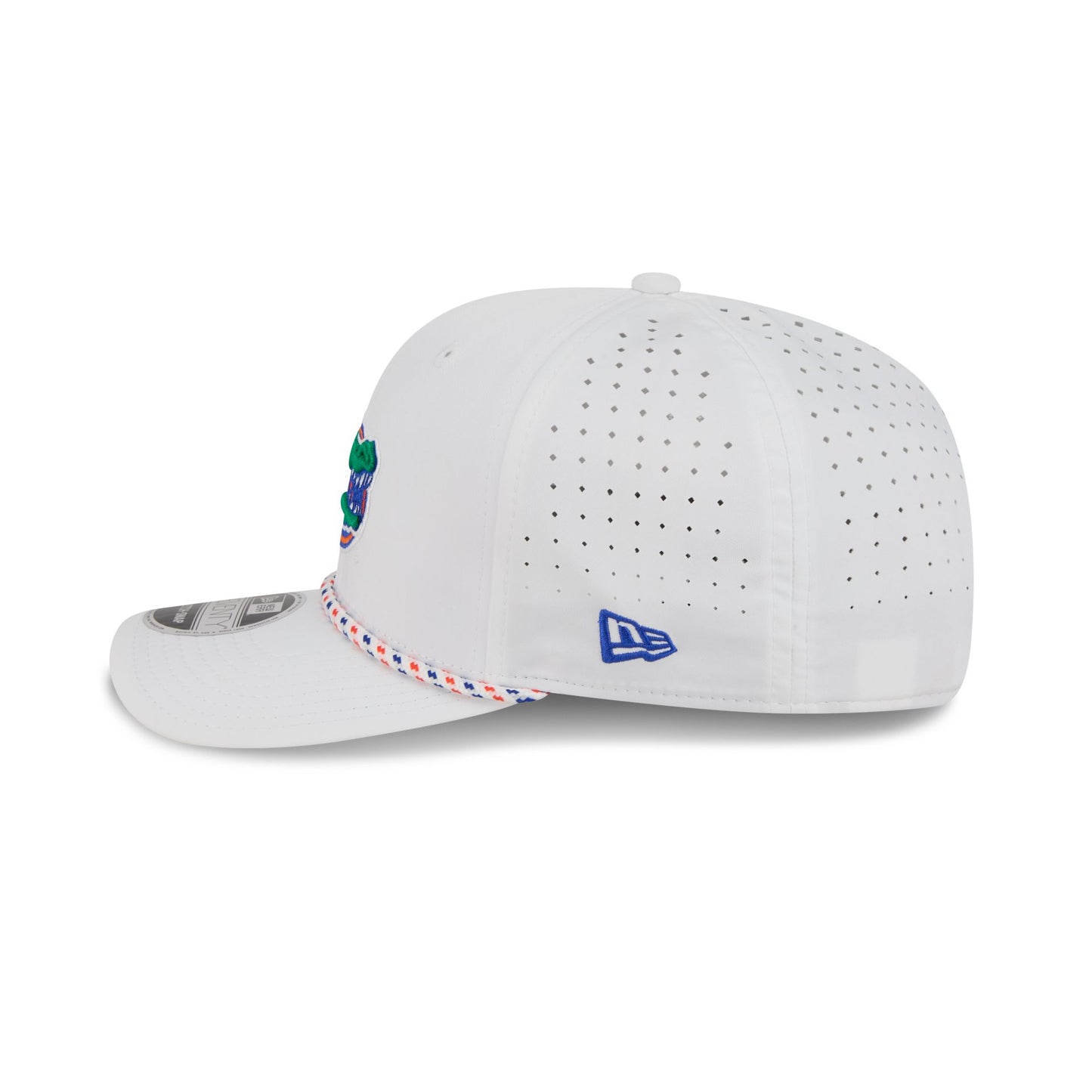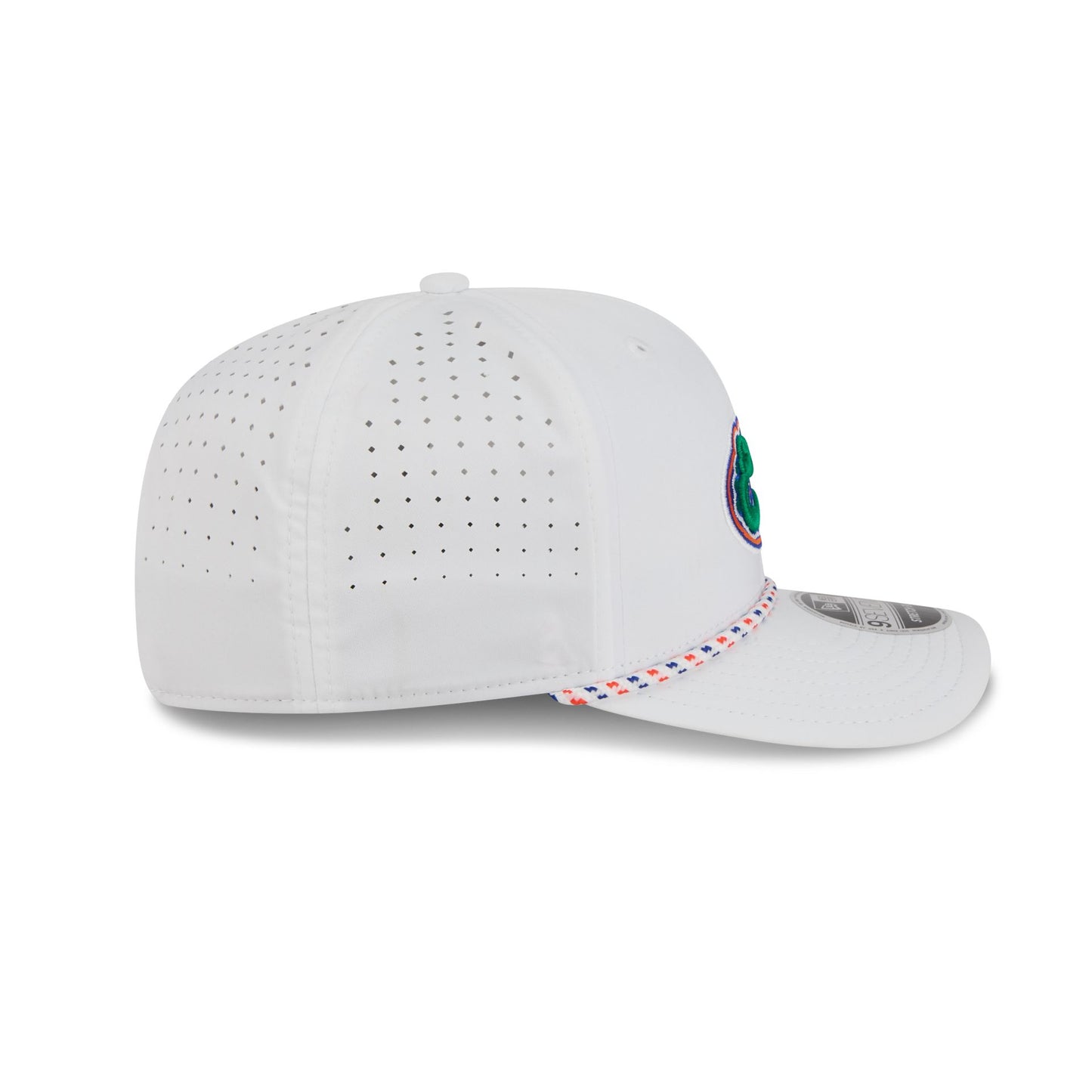 The Florida Gators Optic White Performance Rope 9SEVENTY Stretch-Snap features an embroidered Gators logo at the front panels with a performance fabric throughout. Additional details include a rope at the visor, an adjustable stretch-snap closure at a performance mesh rear, and a team color undervisor.