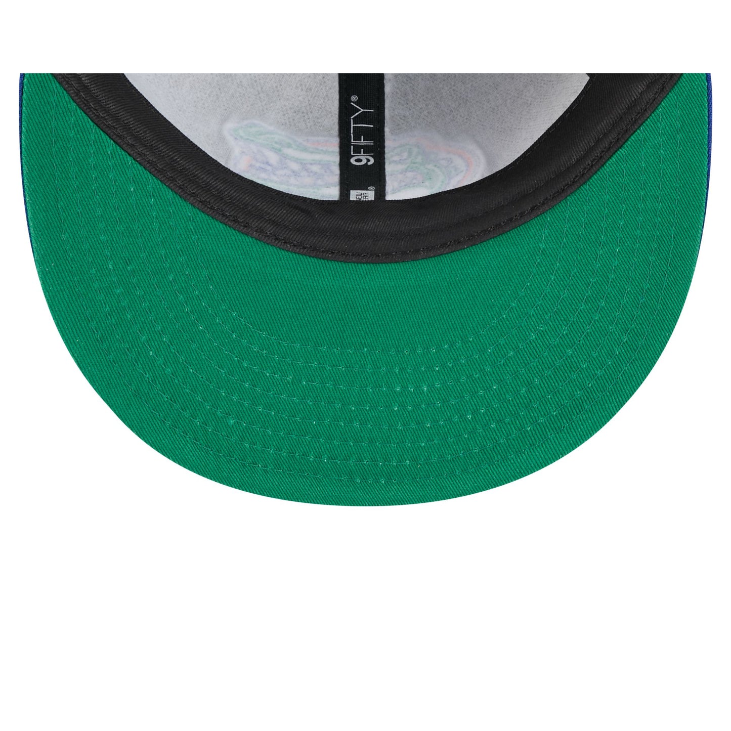 The Florida Gators Tournament Side Patch Retro Crown 9FIFTY Strapback features an embroidered Gators logo at the front panels with a 2007 NCAA Final Four patch at the right-wear side, an adjustable strapback closure at the rear, and a green undervisor.
