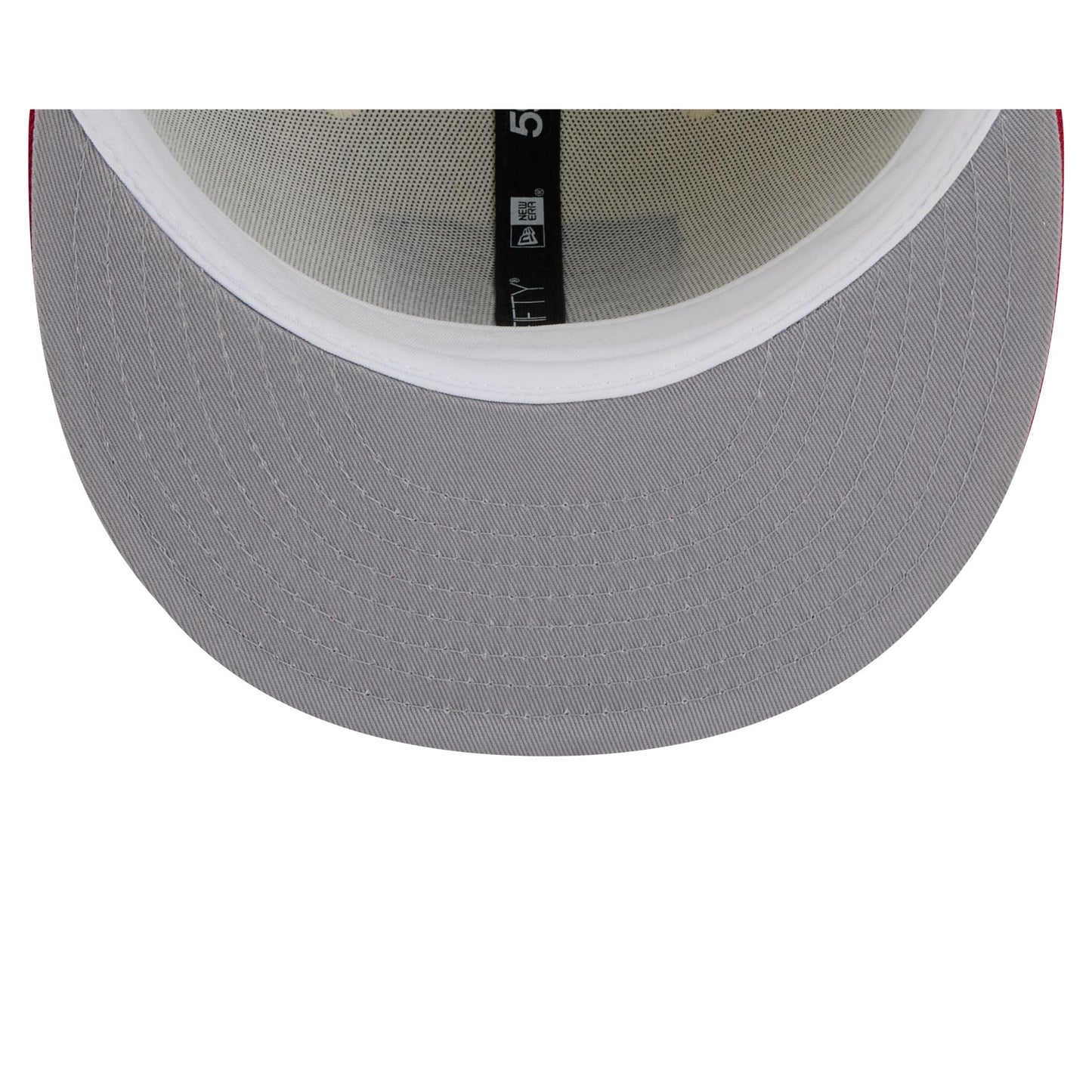 The Florida Panthers Chrome White 59FIFTY Fitted Cap features an embroidered Panthers logo at the front panels with a matching NHL Shield at the rear and a gray undervisor.