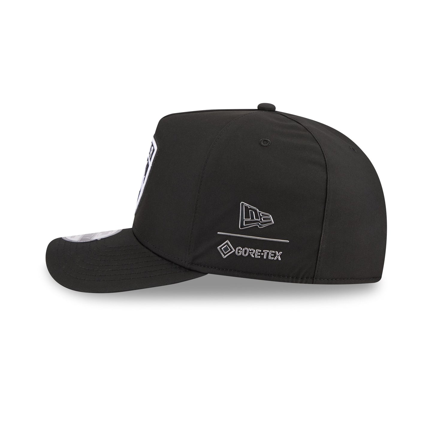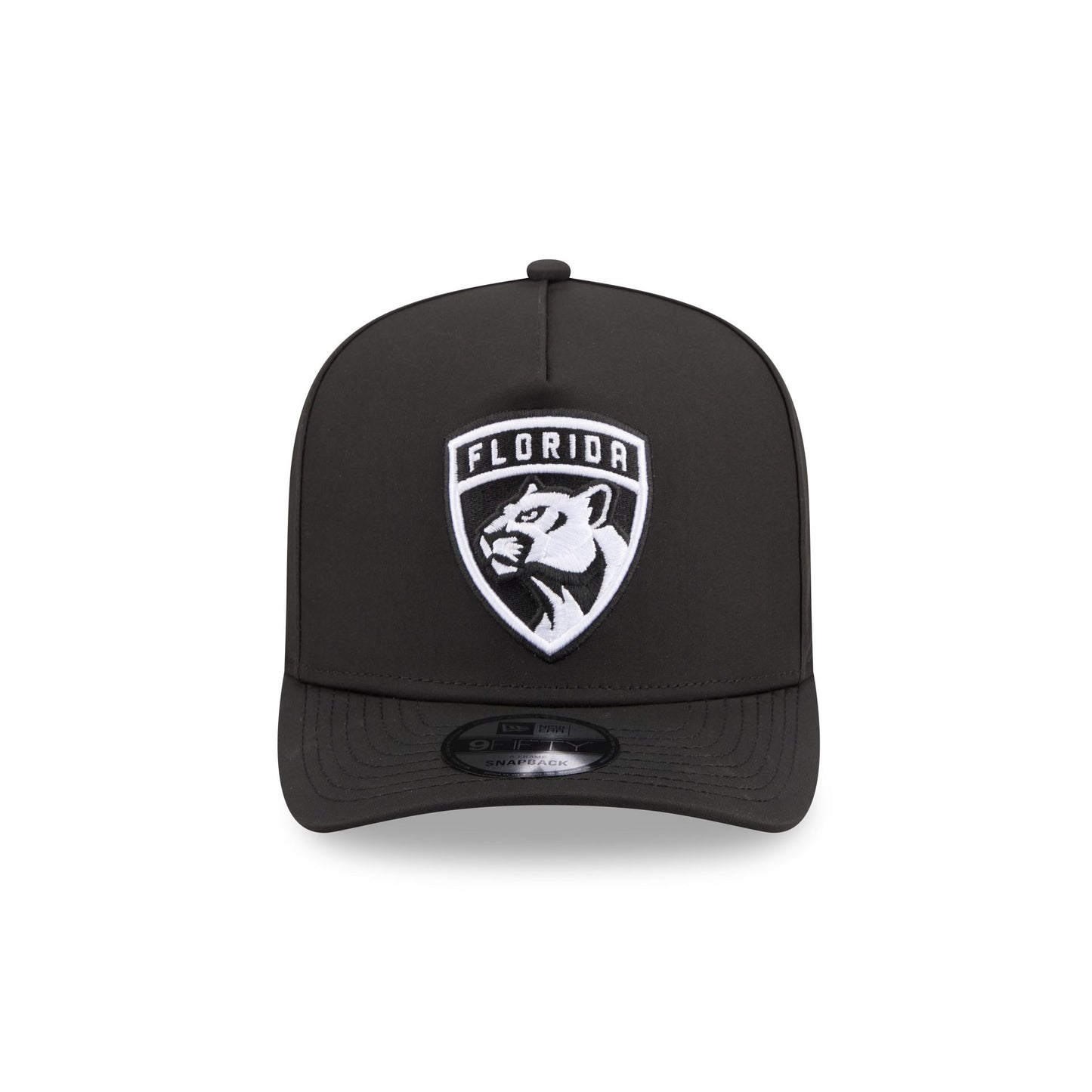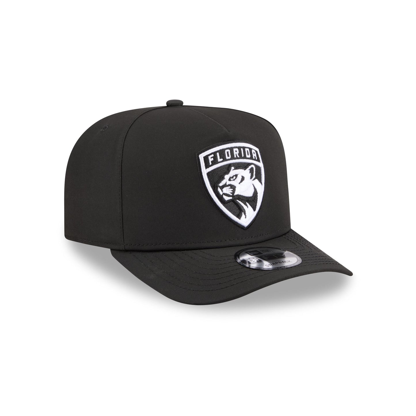 The Florida Panthers GORE-TEX Black 9FIFTY A-Frame Snapback features an embroidered white Panthers logo at the front panels with a metallic sheen silicone New Era Flag logo and GORE-TEX logo at the left-wear side. Additional details include an adjustable snapback closure at the rear, a gray undervisor, and a polyester fabrication throughout the cap. It is waterproof, breathable, and lightweight.