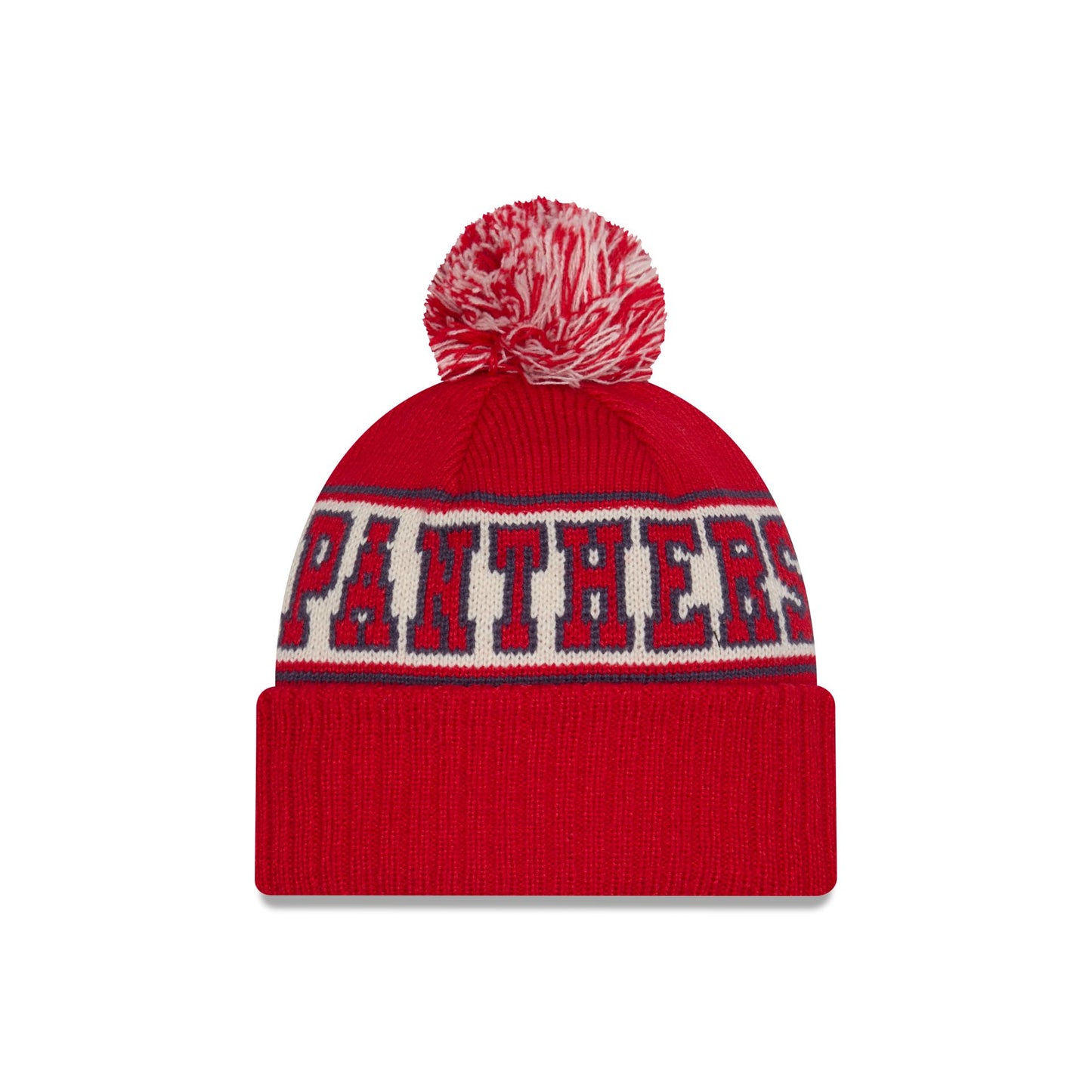 The Florida Panthers Retro Pom Knit Hat features an embroidered Panthers logo at the front cuff with a team wordmark at the crown and a one-time removable pom.