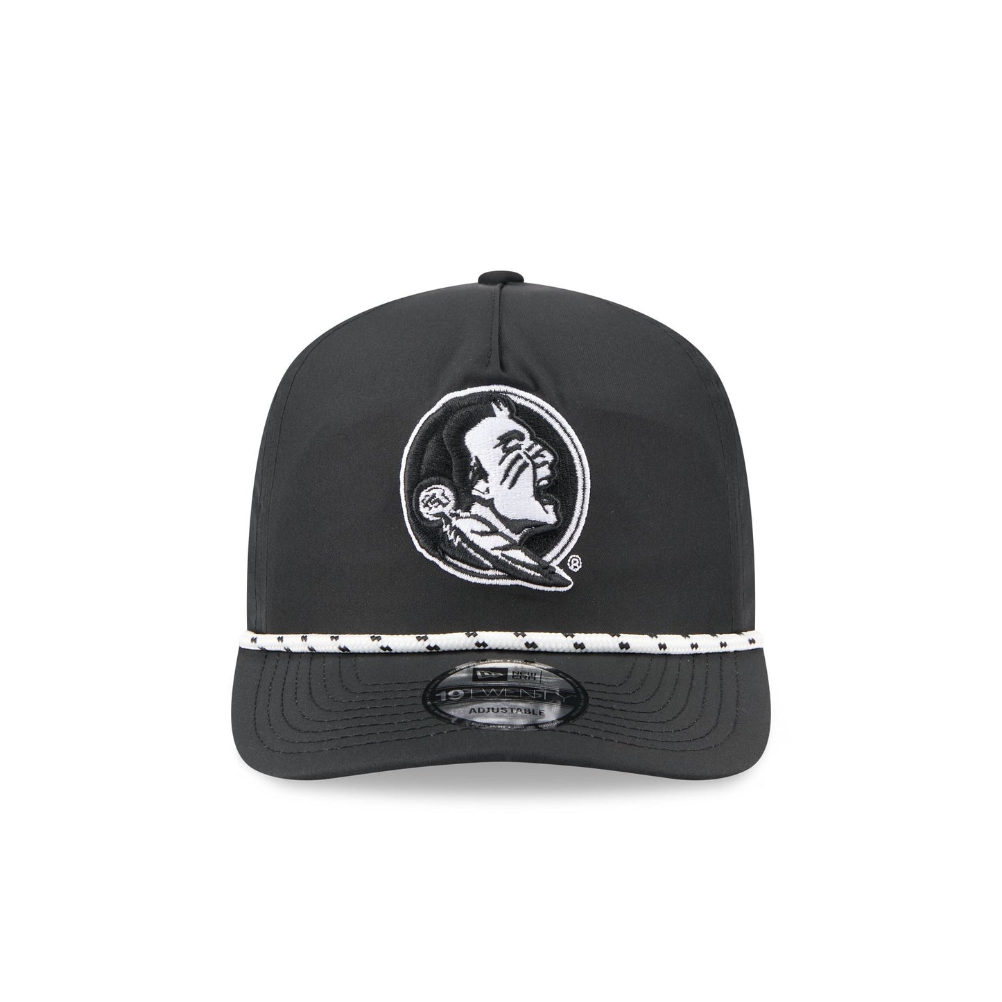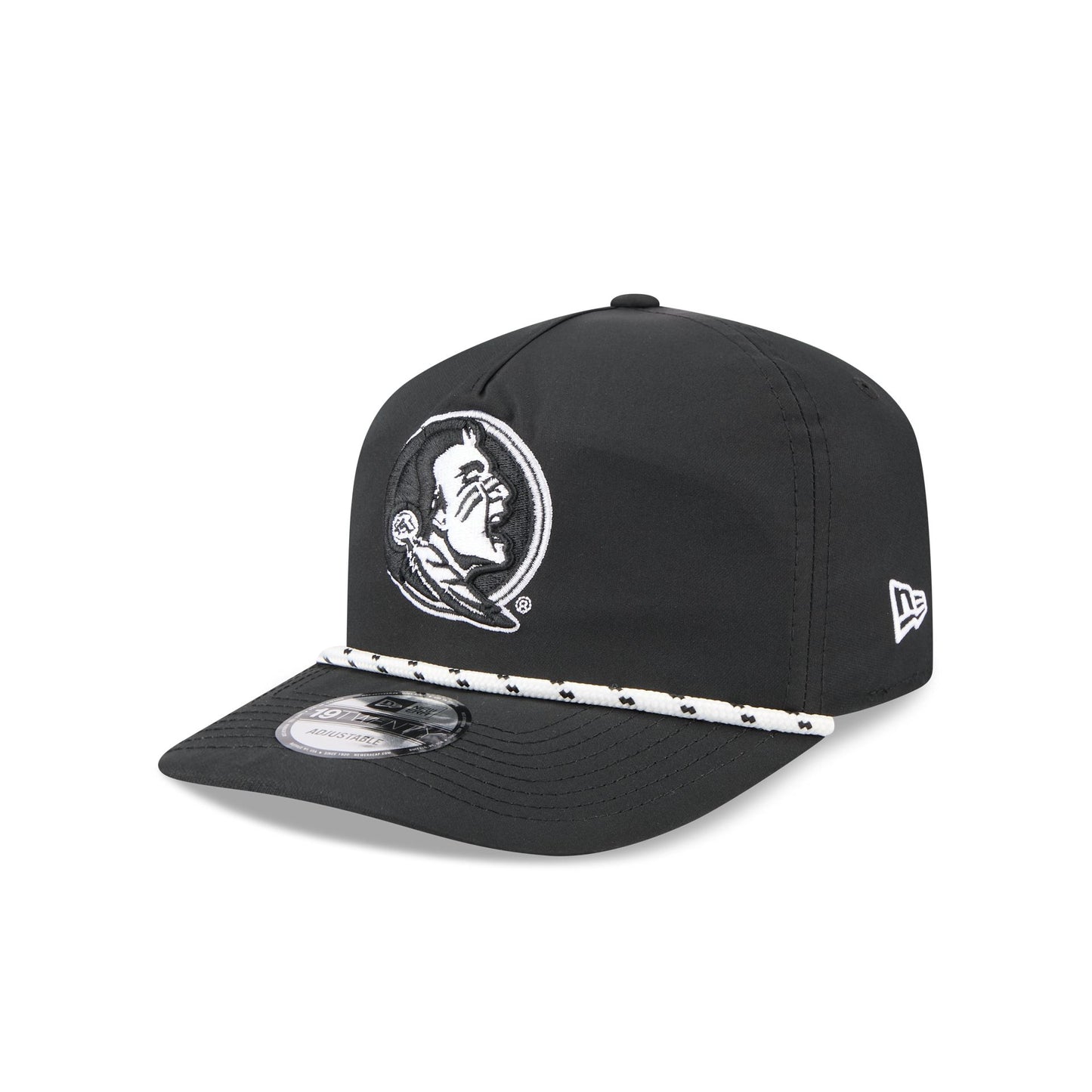 The Florida State Seminoles Black and White Rope 19TWENTY Snapback features an embroidered Seminoles logo and rope at the front with a snapback closure at the rear and a gray undervisor.