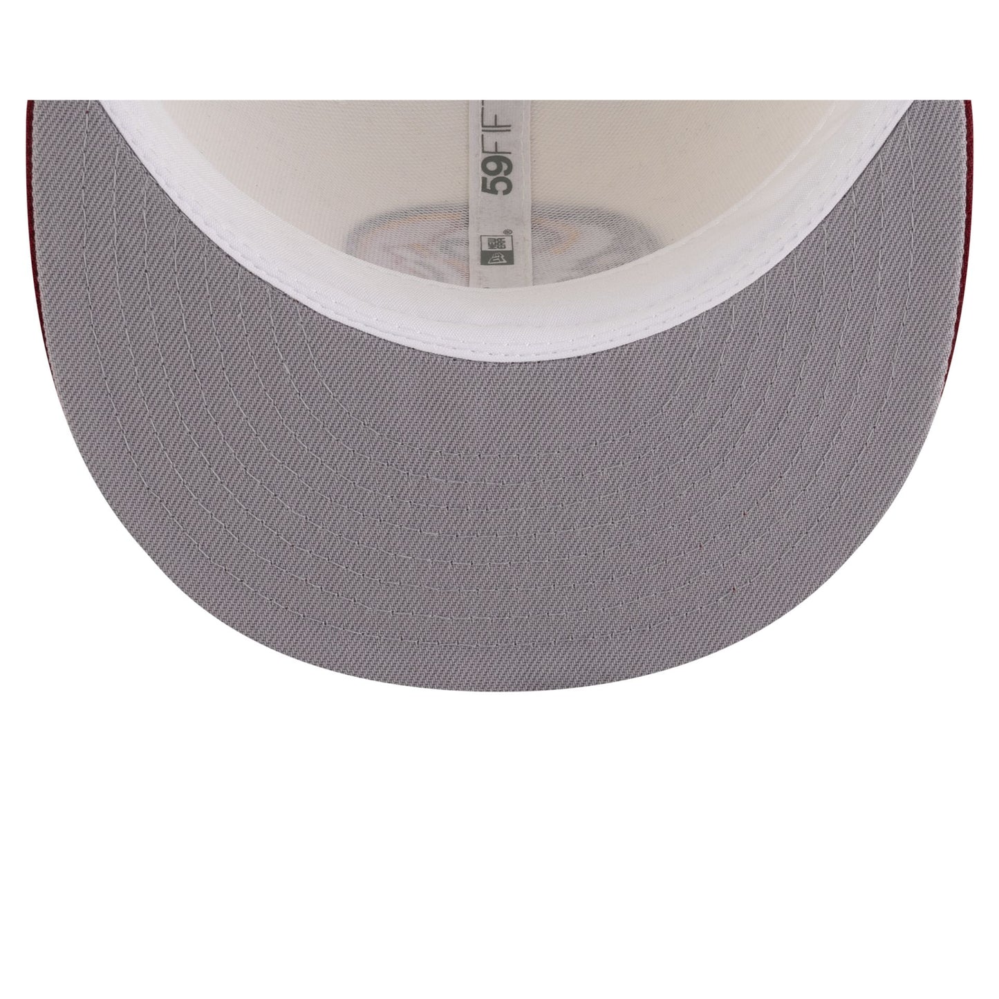 The Florida State Seminoles College Vault Chrome Cardinal 59FIFTY Fitted Cap features an embroidered Seminoles logo at the front panels with a wordmark at the rear and a snapback closure at the rear.