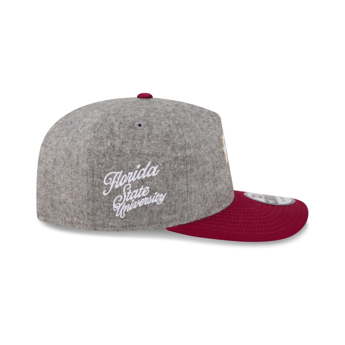The Florida State Seminoles Collegiate Two-Tone Chambray Pre-Curved 19TWENTY Snapback features an embroidered Seminoles logo at the front panel with a team script at the right-wear side. Additional details include an adjustable snapback closure at the rear with a maroon visor and a gray undervisor.