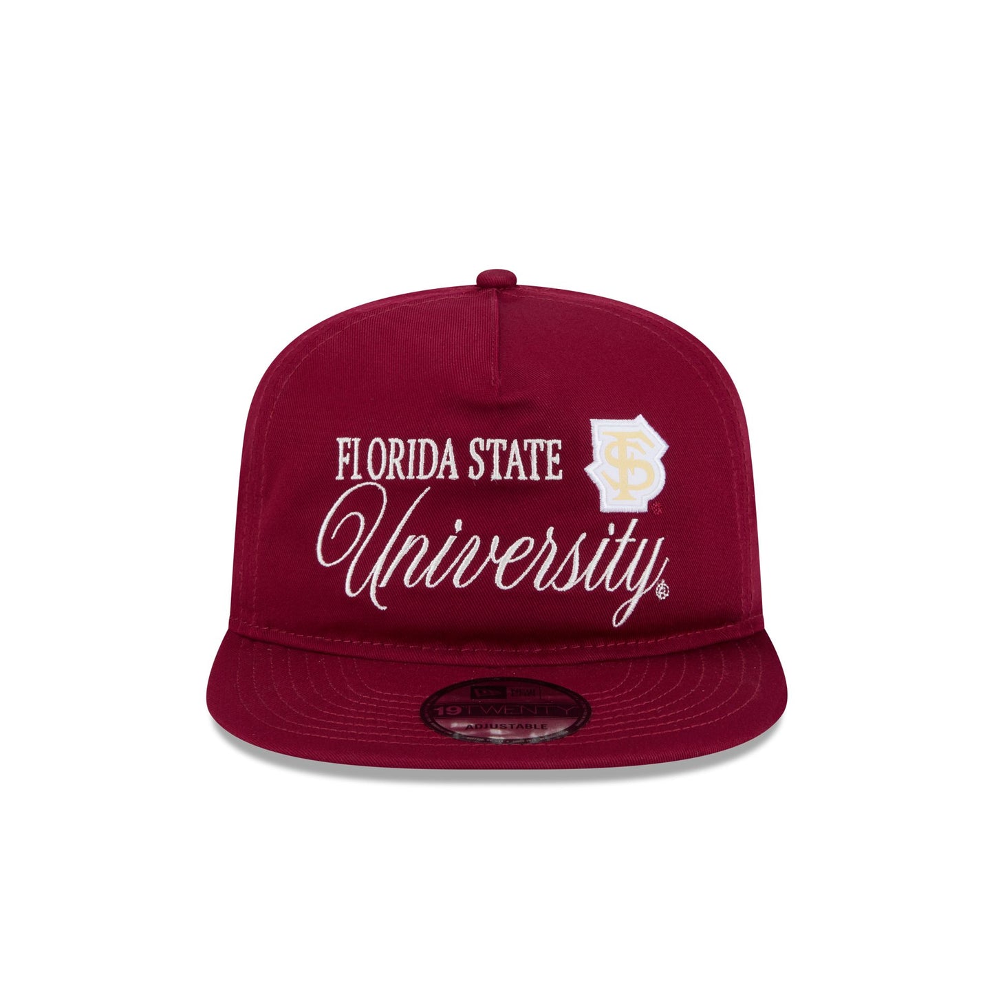 The Florida State Seminoles Script 19TWENTY Snapback features an embroidered Seminoles script and logo patch at the front panel with a snapback closure at the rear and a green undervisor.