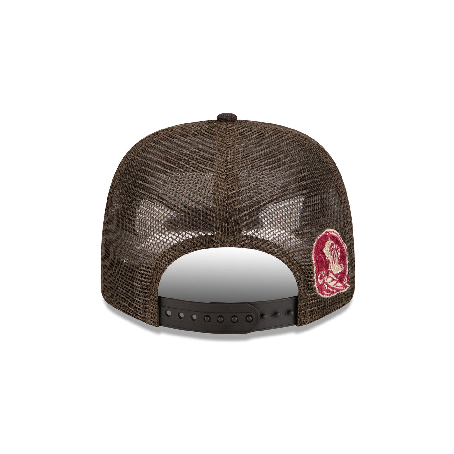 The Florida State Seminoles Wool Plaid 9SEVENTY Trucker features an embroidered Seminoles badge at the front panels with a matching team logo at the right of an adjustable stretch-snap closure at the rear and a brown undervisor.