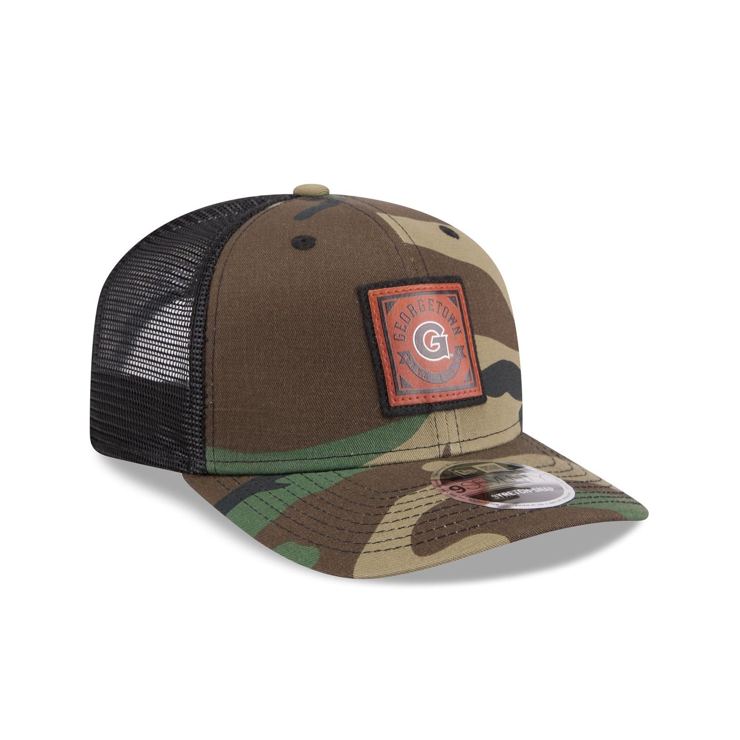 The Georgetown Hoyas Camo Canvas 9SEVENTY Trucker features a woven faux leather Hoyas patch at the front panels against a camo pattern. Additional details include an adjustable stretch-snap closure at a mesh rear and a gray undervisor.