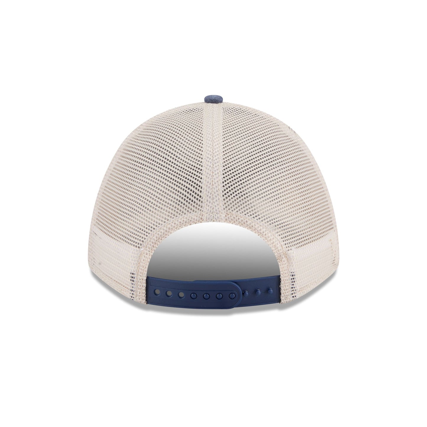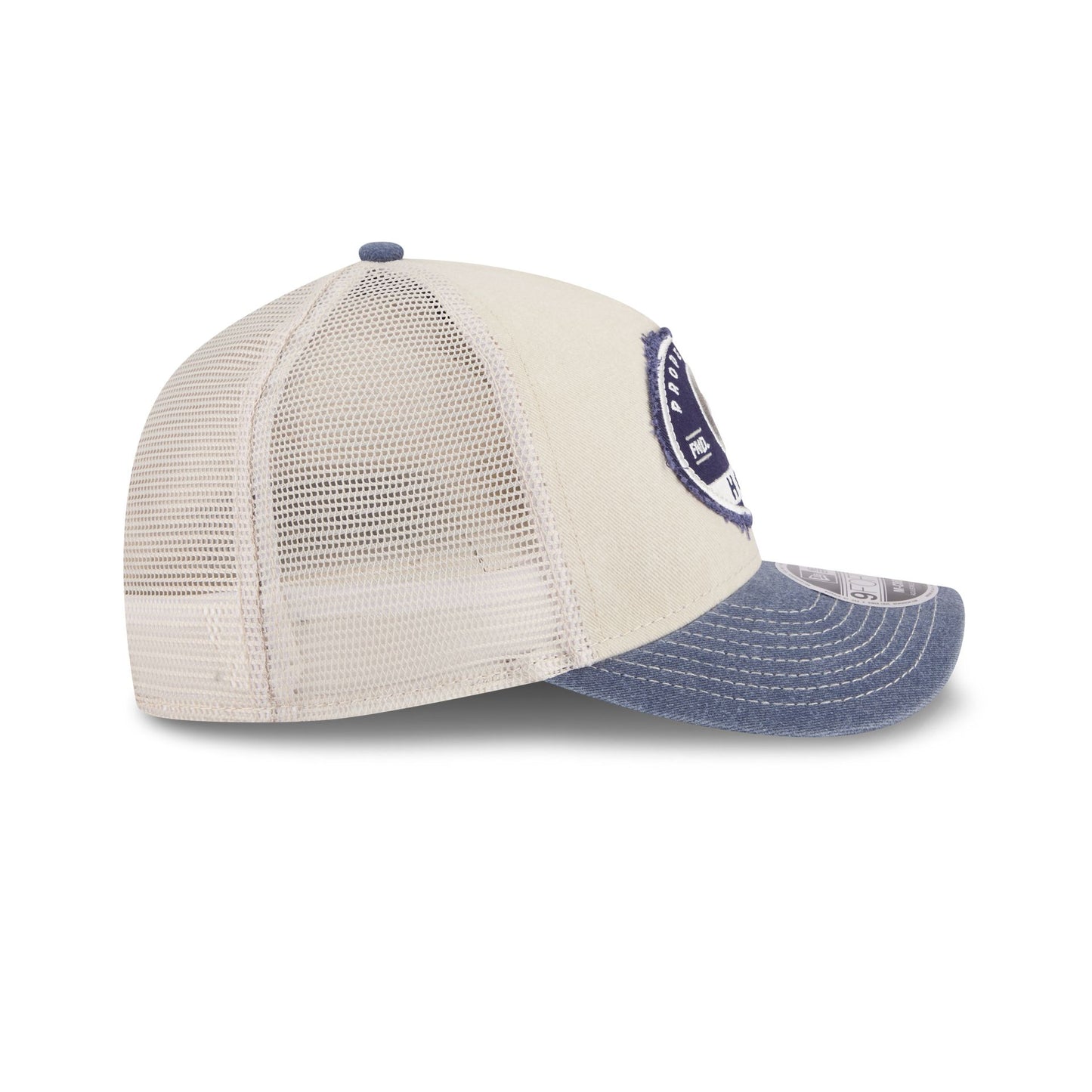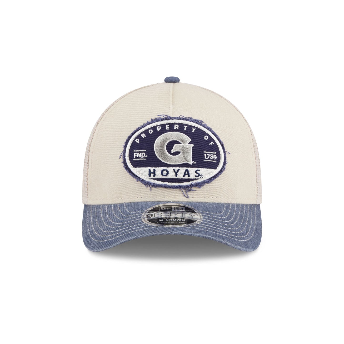 The Georgetown Hoyas Frayed 9FORTY M-Crown A-Frame Trucker features an embroidered frayed Hoyas circle graphic at the front panels with a denim visor. Additional details include an adjustable snapback closure at a mesh rear and a gray undervisor.