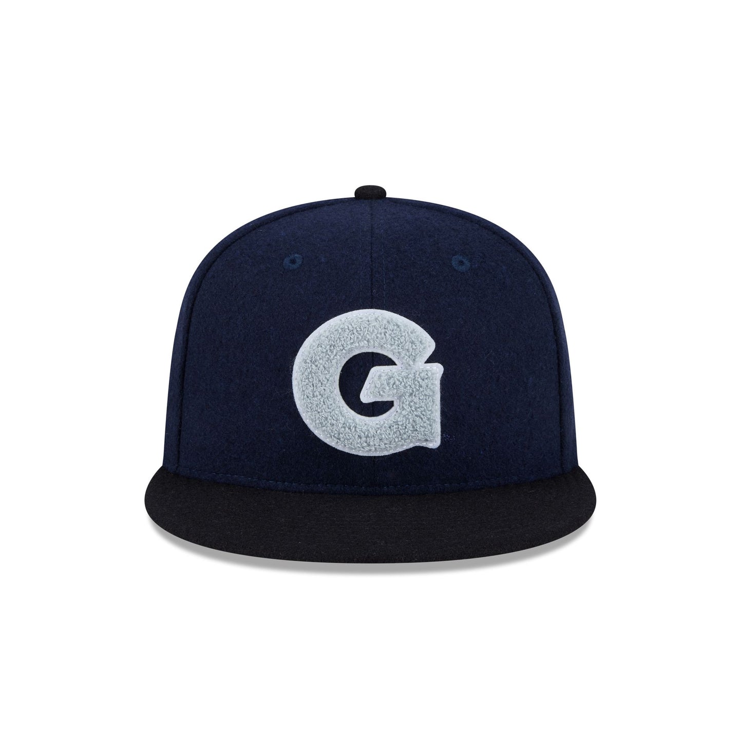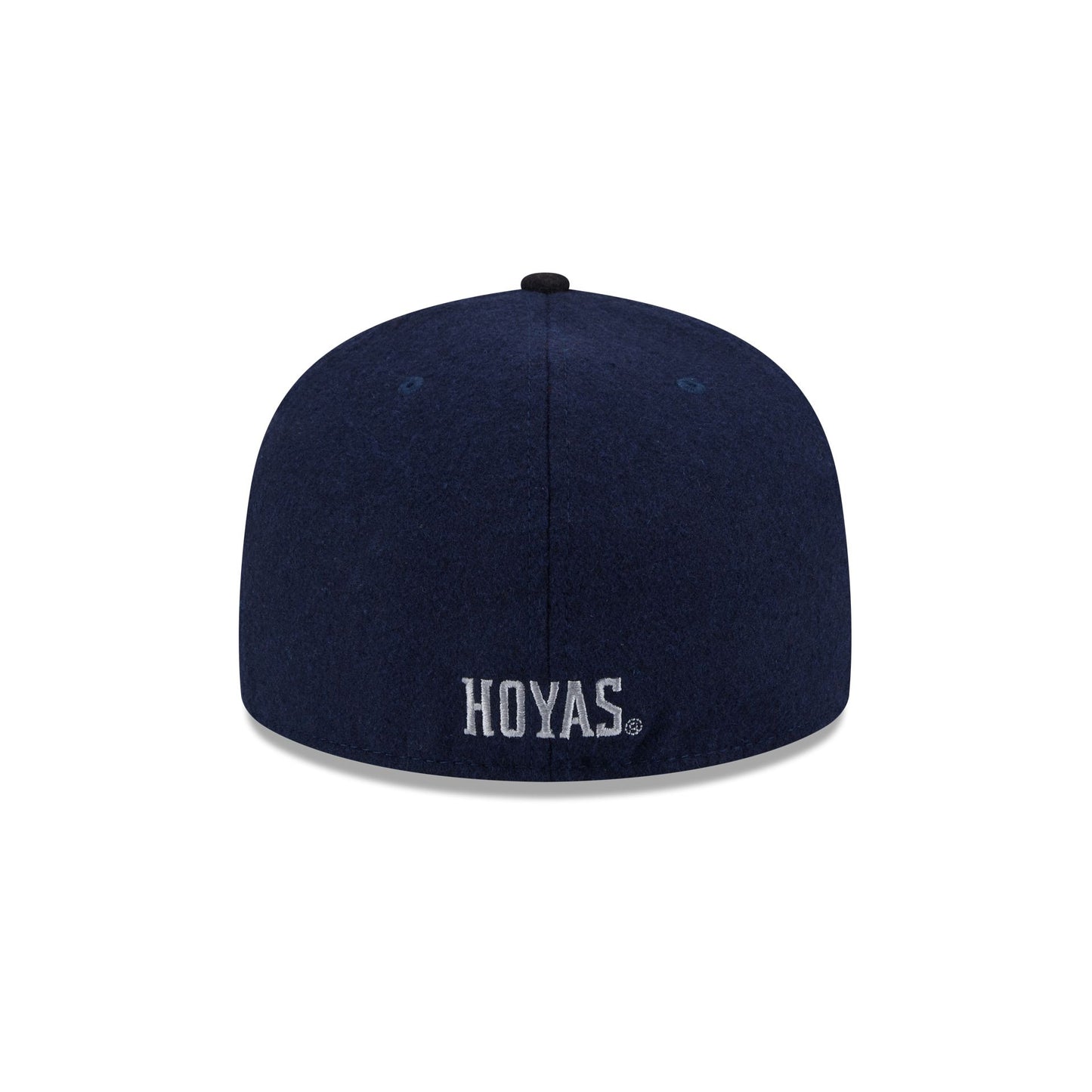 The Georgetown Hoyas Melton Wool 59FIFTY Fitted Cap features a chenille applique Hoyas logo patch at the front panels with an embroidered team wordmark at the rear and a gray undervisor.