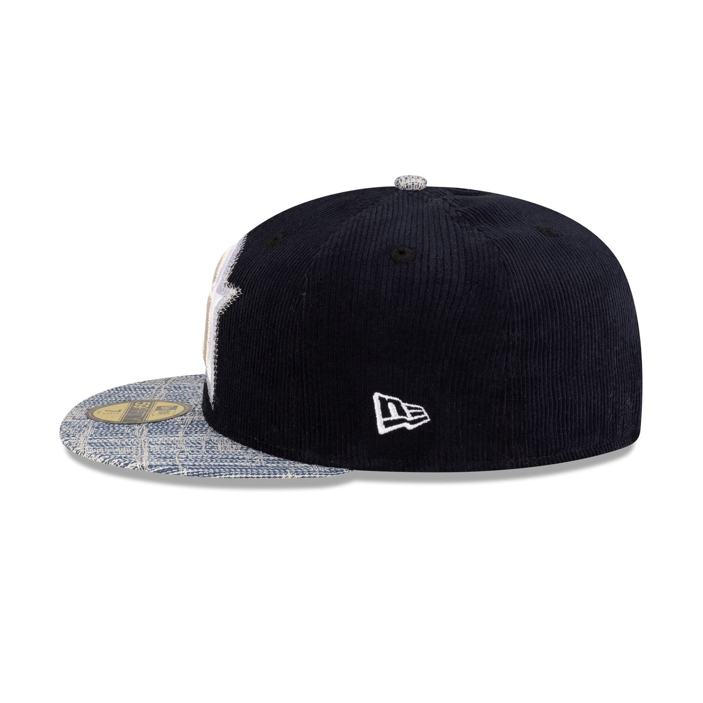 The Georgetown Hoyas Navy Cord Denim 59FIFTY Fitted Cap features an embroidered HOYAS logo at the front panels against a corduroy fabrication throughout. Additional details include a cross-stitch visor, a logo at the rear, and a green undervisor.