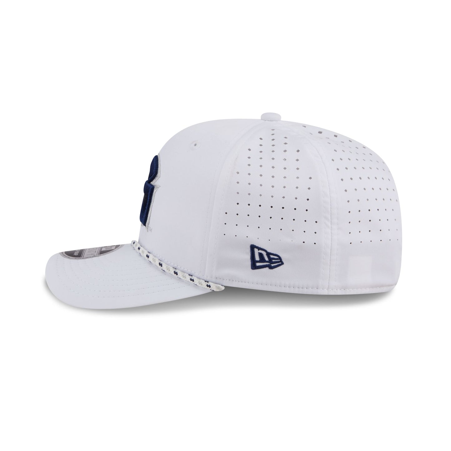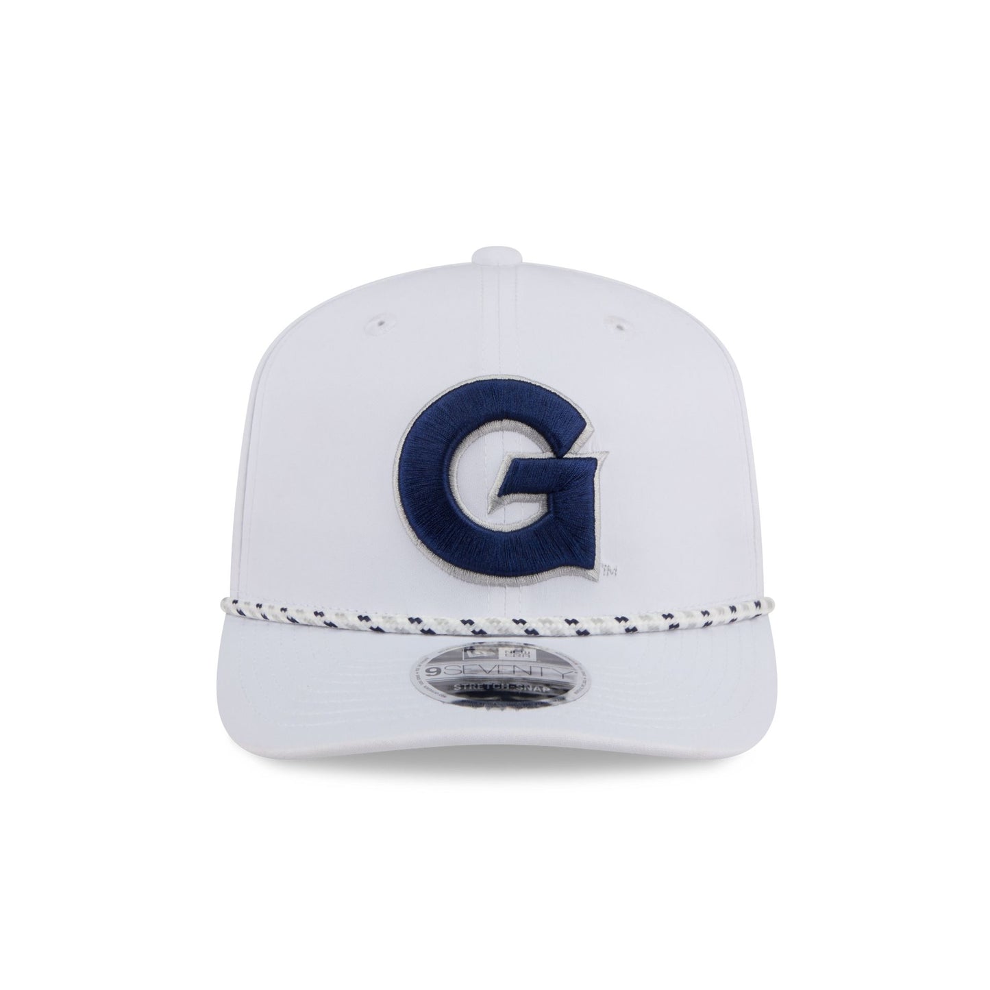 The Georgetown Hoyas Optic White Performance Rope 9SEVENTY Stretch-Snap features an embroidered Hoyas logo at the front panels with a performance fabric throughout. Additional details include a rope at the visor, an adjustable stretch-snap closure at a performance mesh rear, and a team color undervisor.