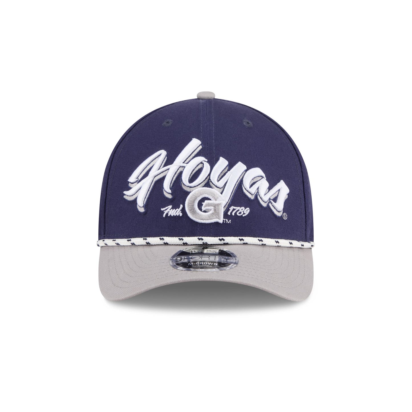 The Georgetown Hoyas Team Loyal 9FORTY M-Crown Snapback features an embroidered Hoyas wordmark graphic at the front panels with a rope at the visor. Additional details include an adjustable snapback closure at the rear and a gray undervisor.