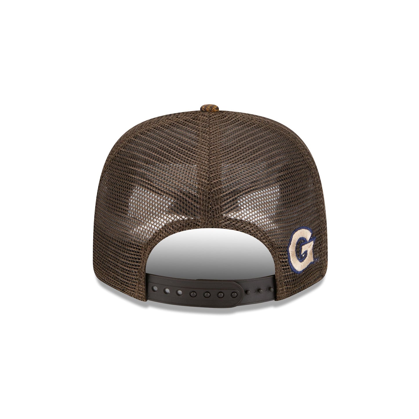 The Georgetown Hoyas Wool Plaid 9SEVENTY Trucker features an embroidered Hoyas badge at the front panels with a matching team logo at the right of an adjustable stretch-snap closure at the rear and a brown undervisor.