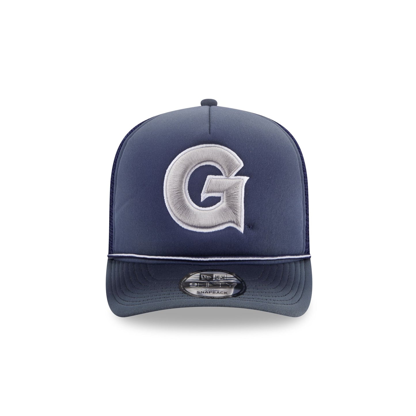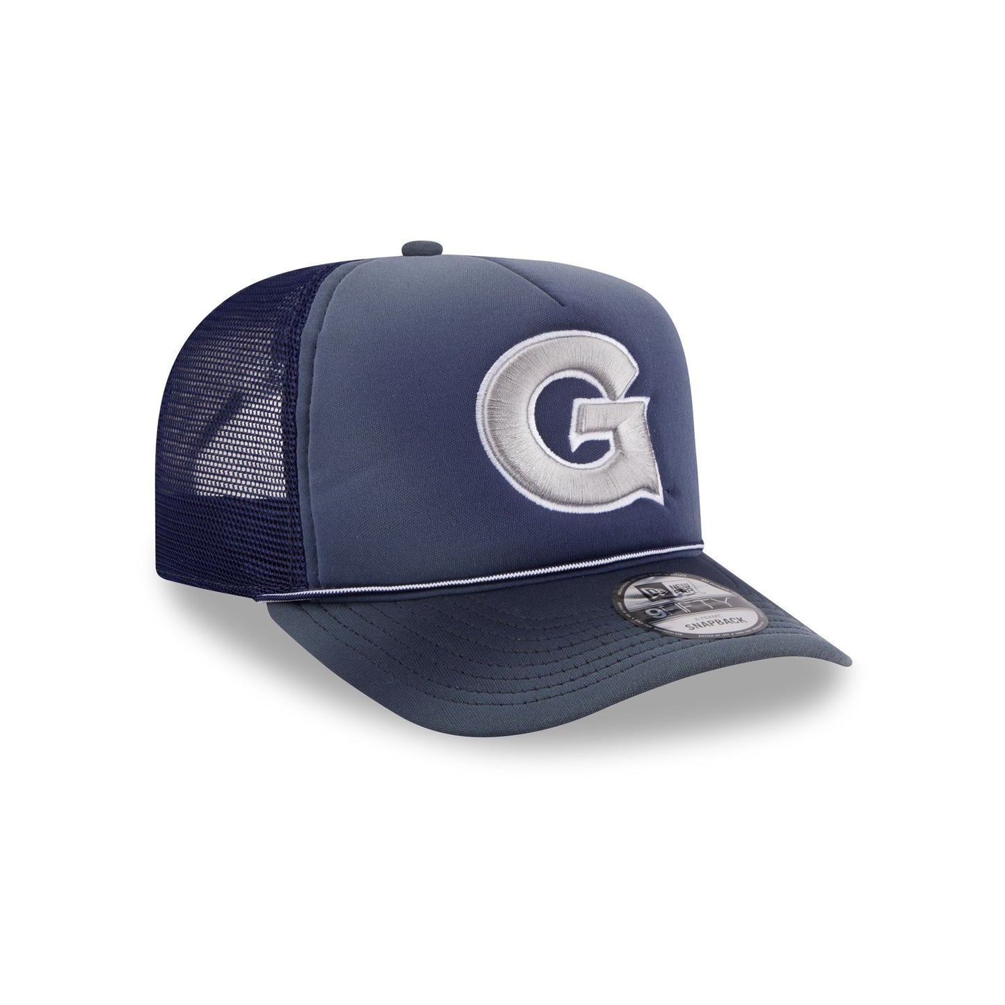 The Georgetown Hoyas Worn 9FIFTY A-Frame Trucker features an embroidered Hoyas logo at the front panels against a softly washed fabrication. Additional details include an adjustable snapback closure at a mesh rear and a gray undervisor.