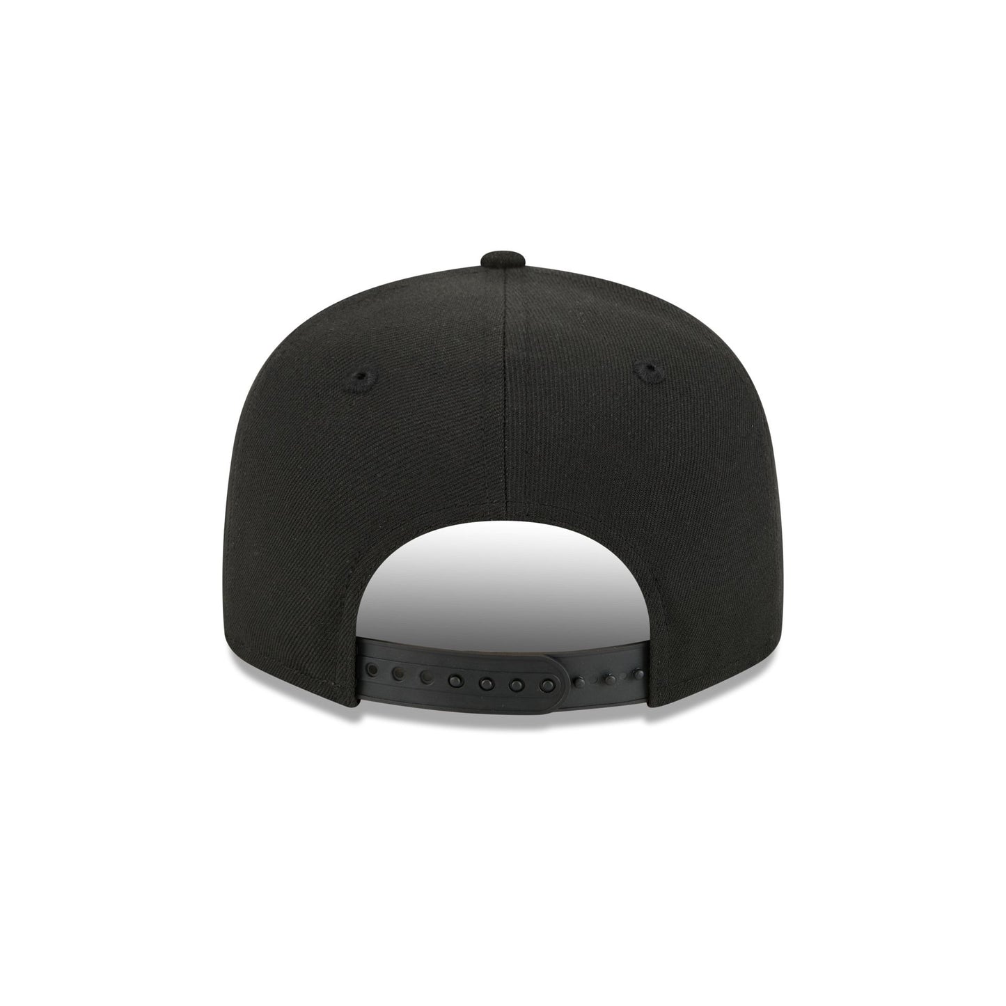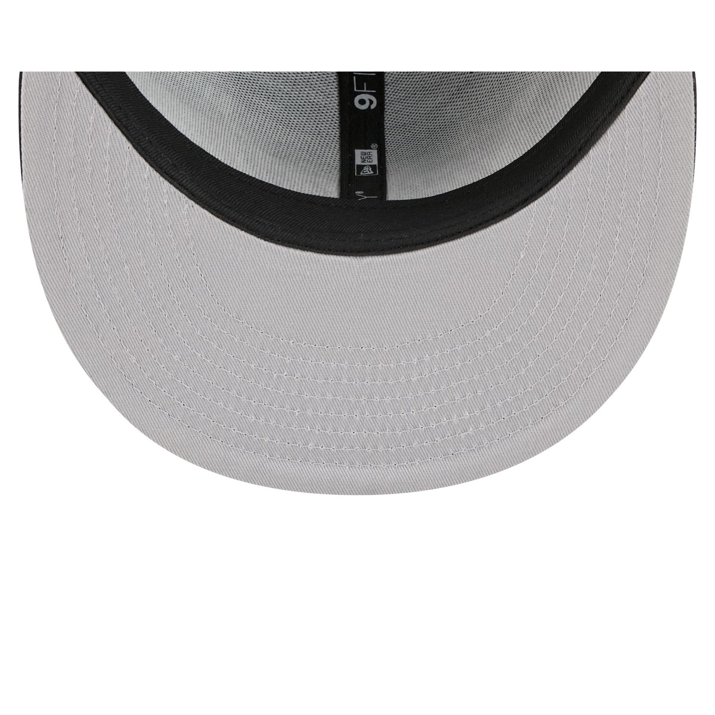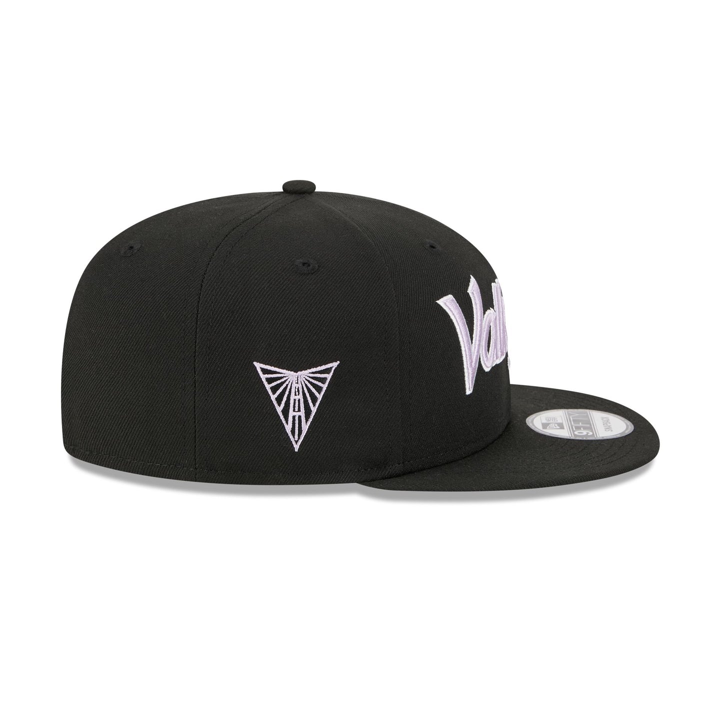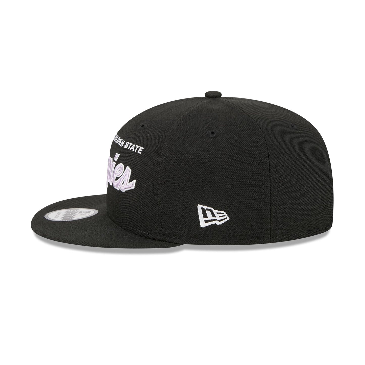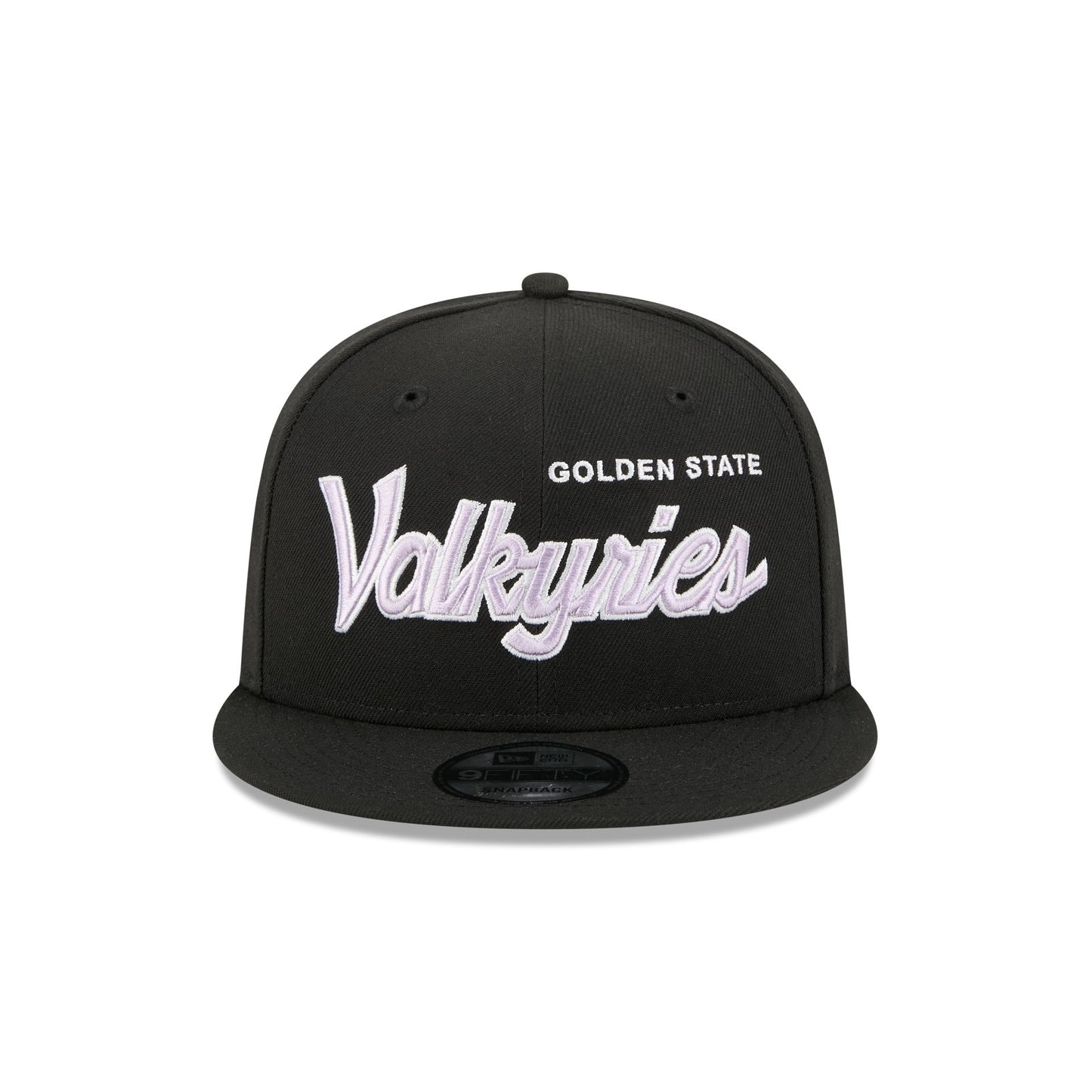 The Golden State Valkyries Script 9FIFTY Snapback features an embroidered Valkyries wordmark at the front panels with a matching team logo at the right-wear side, a snapback closure at the rear, and a gray undervisor.