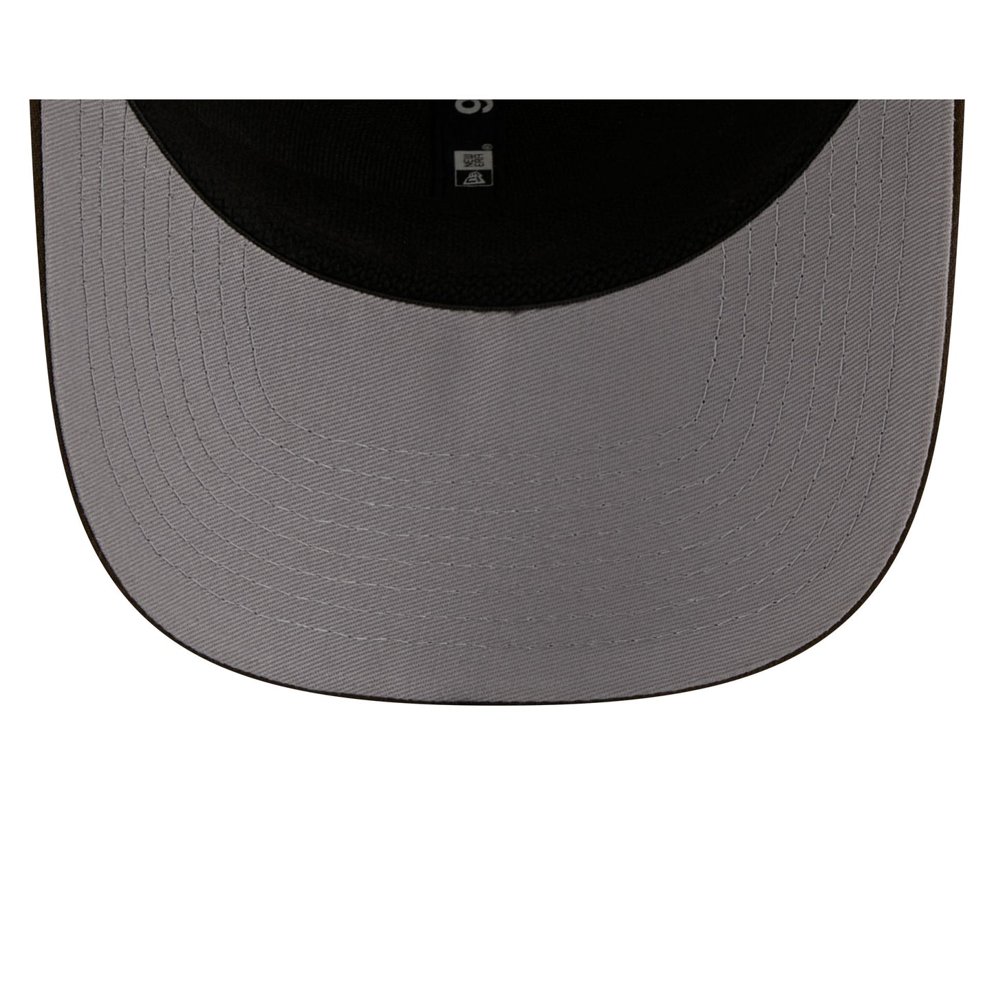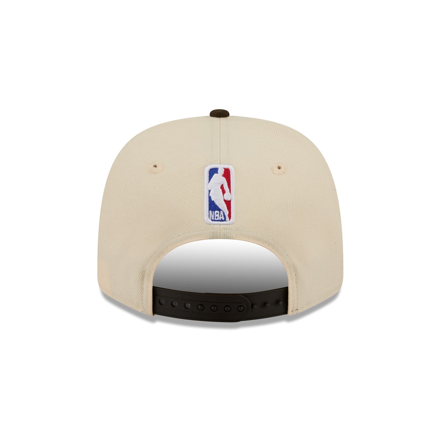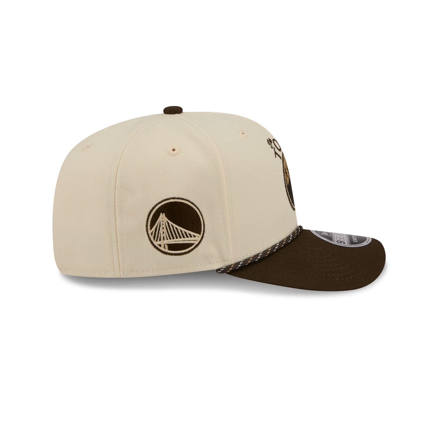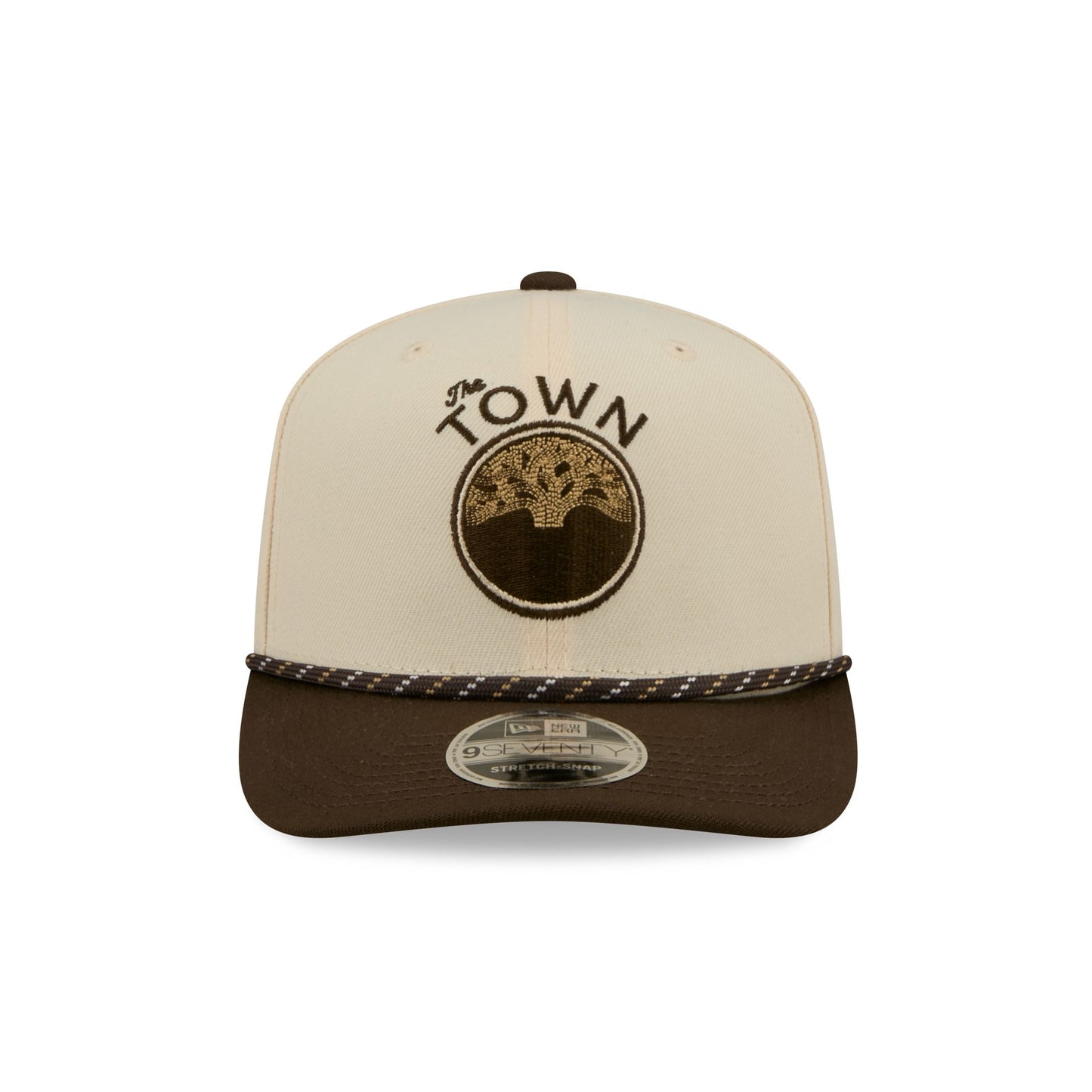 The Golden State Warriors 2025 City Edition 9SEVENTY Stretch-Snap features an embroidered Warriors City Edition logo at the front panels with a logo at the right-wear side and a rope at the visor. Additional details include the NBA Logoman above an adjustable stretch-snap closure at the rear and a gray undervisor.