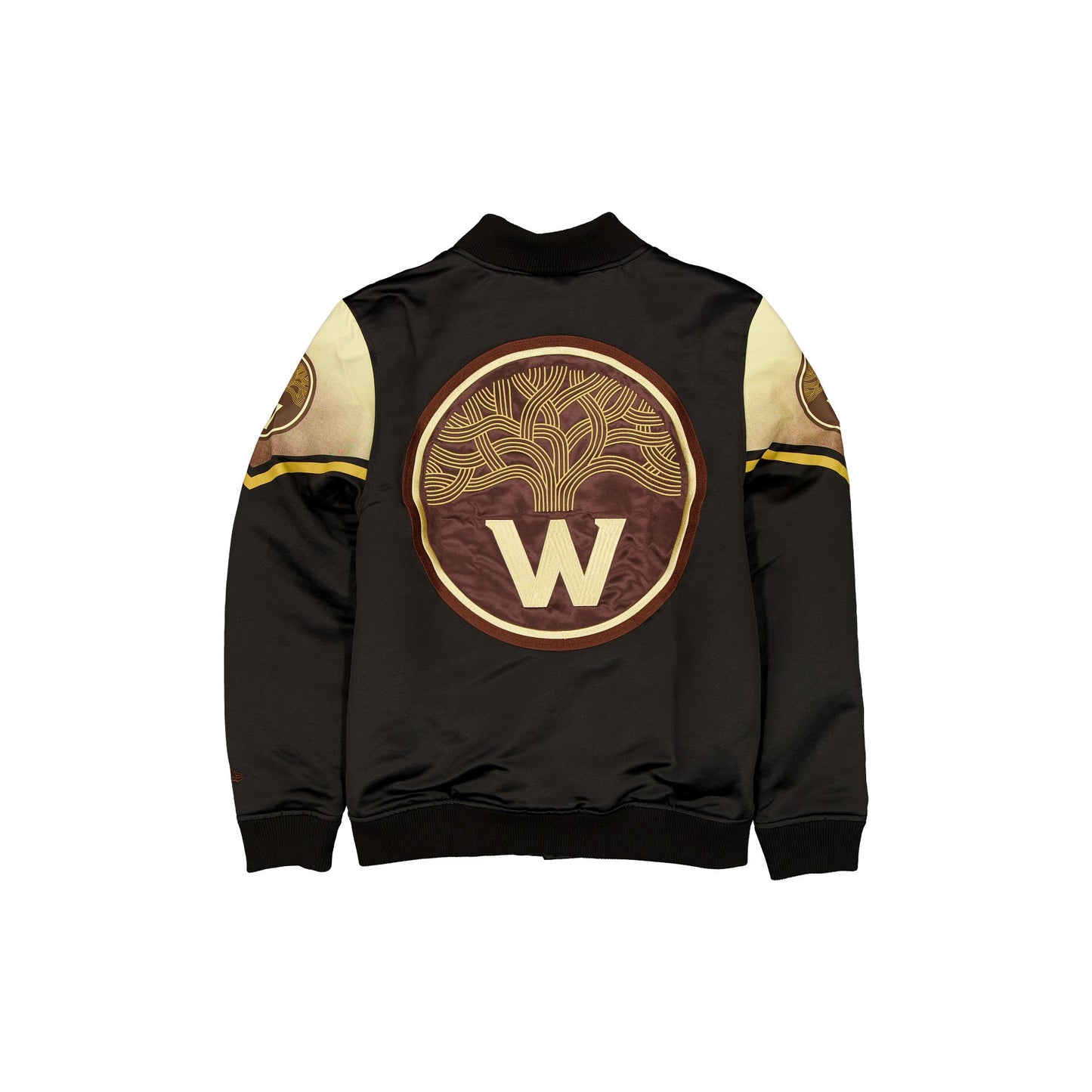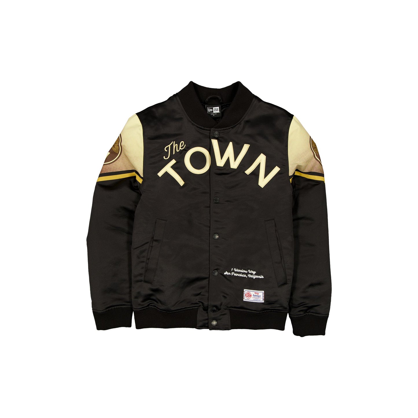 The Golden State Warriors 2025 City Edition Black Jacket features an embroidered Warriors City Edition wordmark at the front with an embroidered script arena address and woven City Edition jock tag at the left hip. Additional details include an applique graphic at the rear, a satin fabrication throughout, and a snap-button closure with front pockets.