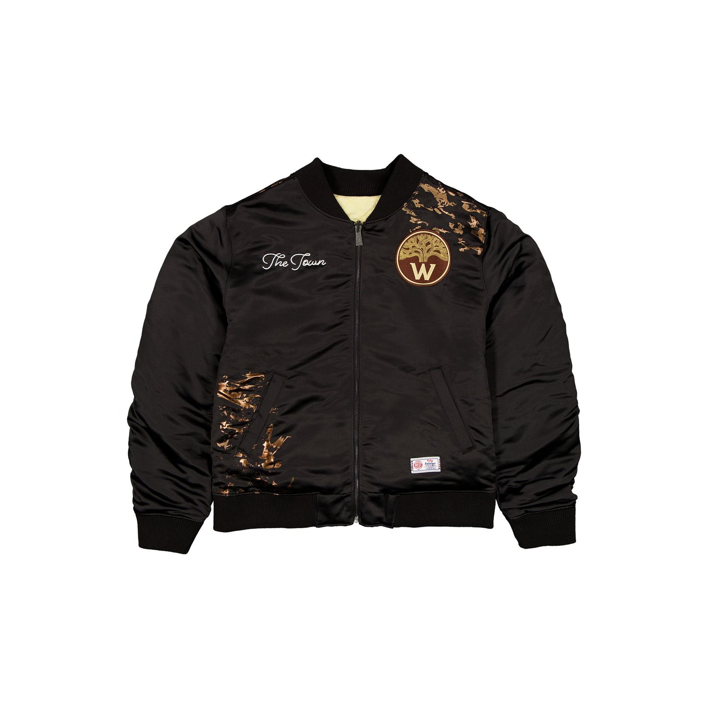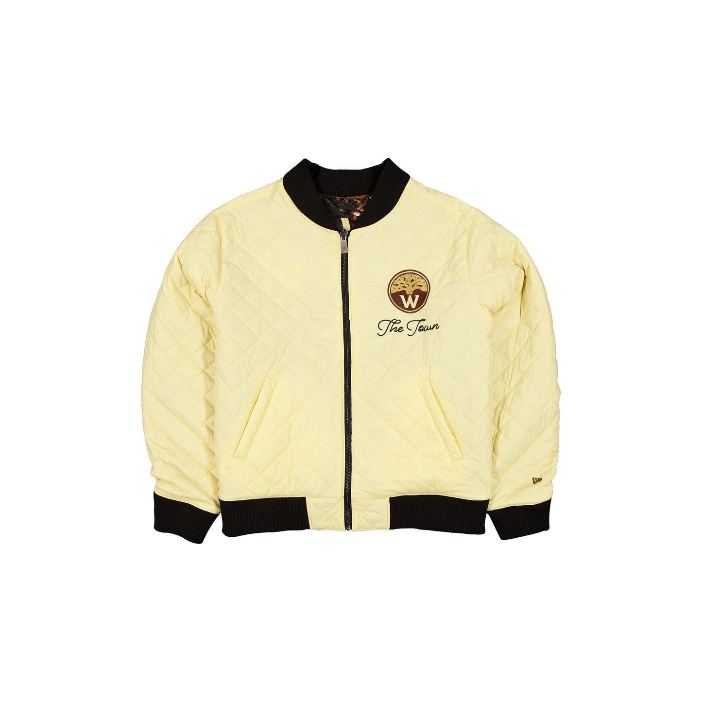 The Golden State Warriors 2025 City Edition Women's Black Jacket features a chain stitch Warriors City Edition wordmark at the right chest and an embroidered logo to the left. Additional details include a City Edition jock tag at the left hip, front pockets, and a full-zip closure. This jacket is reversible, featuring a quilted interior and a chain-stitched wordmark and embroidered logo at the left chest.
