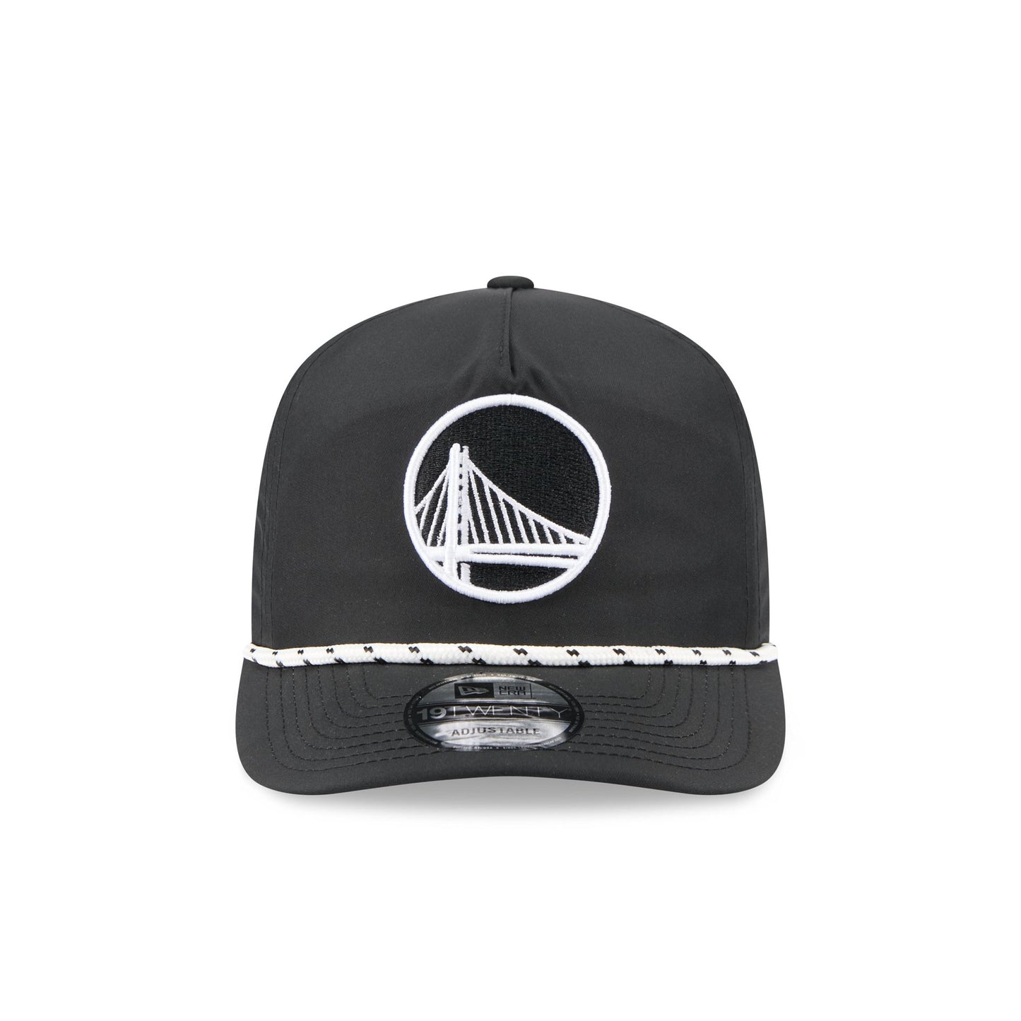 The Golden State Warriors Black and White Rope 19TWENTY Snapback features an embroidered Warriors logo and rope at the front with a snapback closure at the rear and a gray undervisor.