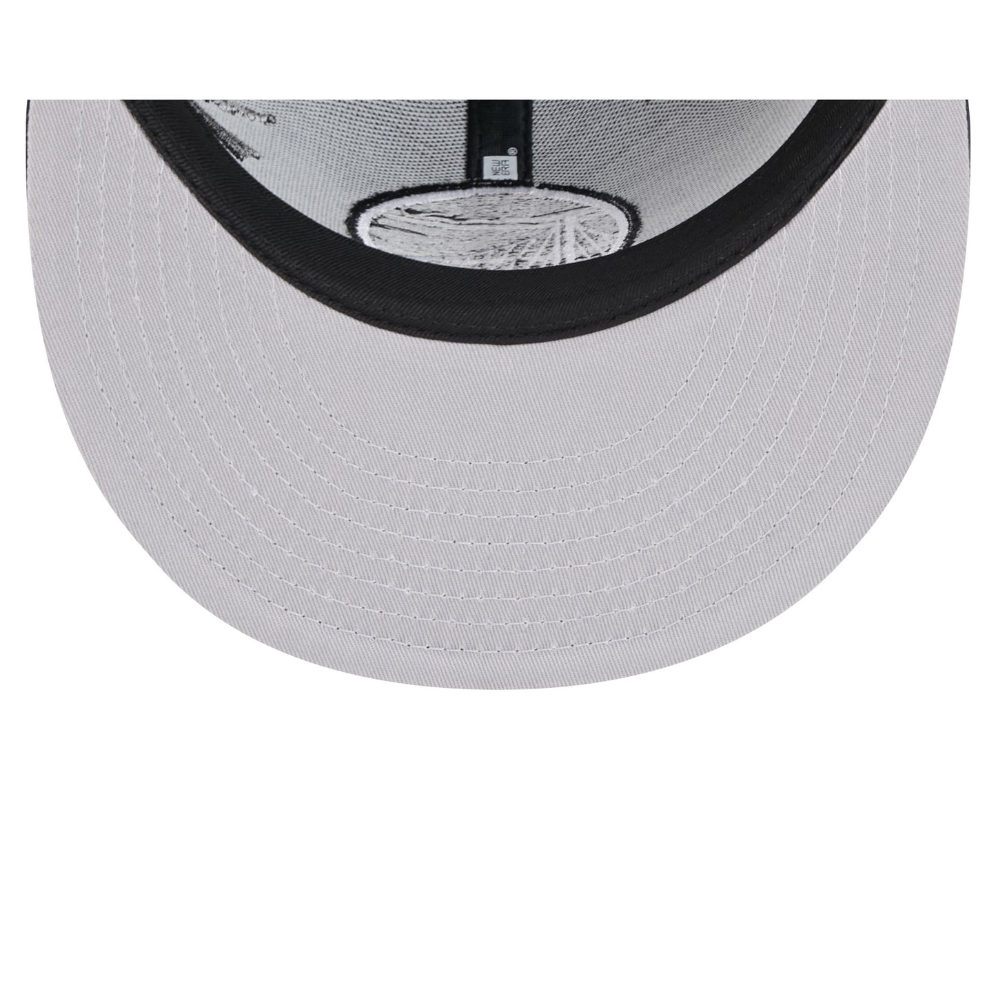 The Golden State Warriors City Art 9FIFTY Snapback features an embroidered Warriors black and white logo at the front panels and an embroidered city banner with art at the right-wear side. Additional details include a snapback closure at the rear and a gray undervisor.