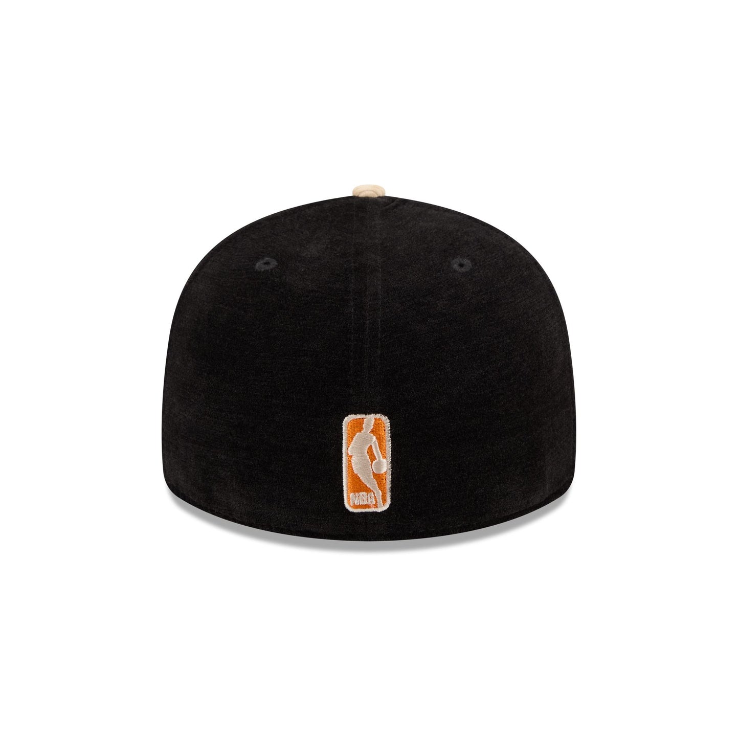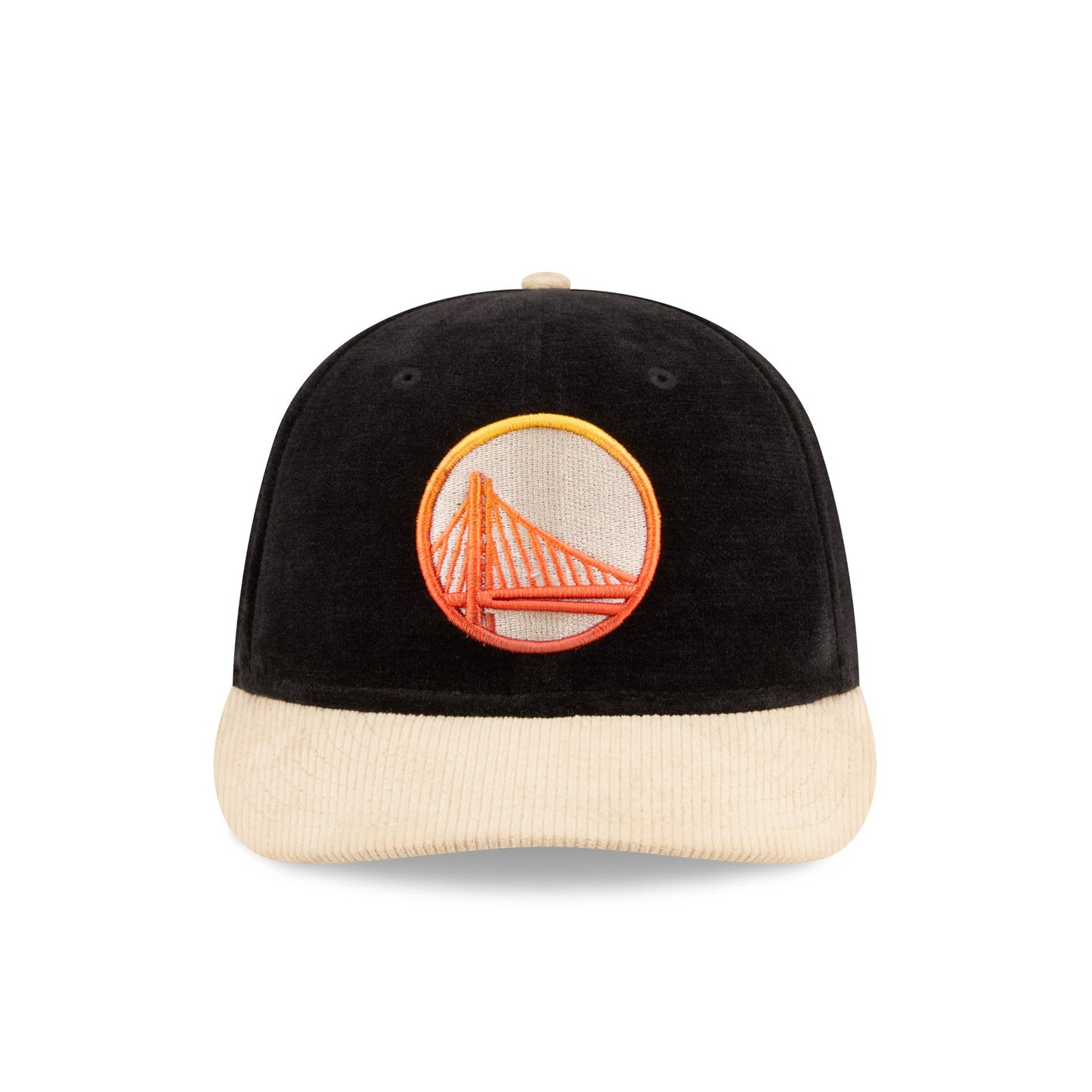 The Golden State Warriors Fall Velvet Low Profile 59FIFTY Fitted Cap features an embroidered Warriors fall gradient logo at the front panels against a velvet fabrication throughout. Additional details include an antique brass leather stitch down city plate at the right-wear side, a matching NBA Logoman at the rear, and a green undervisor.