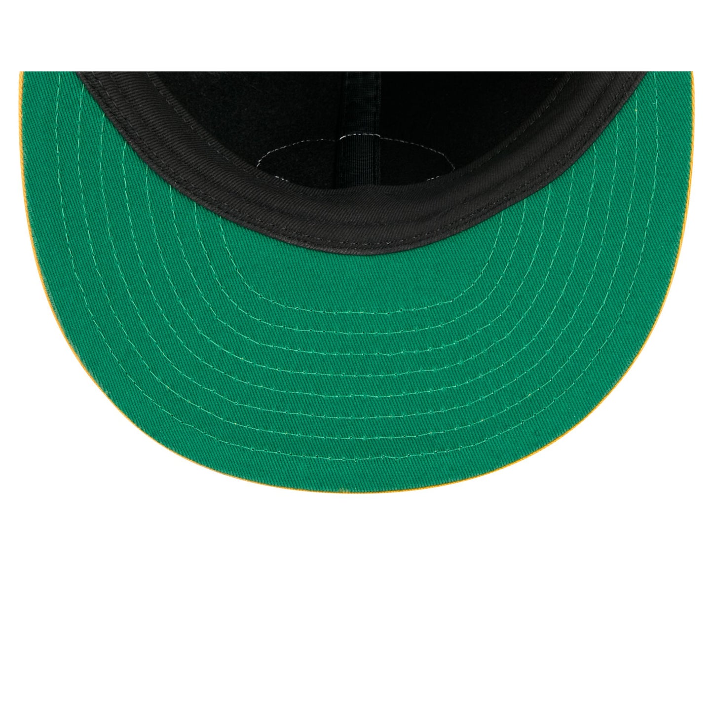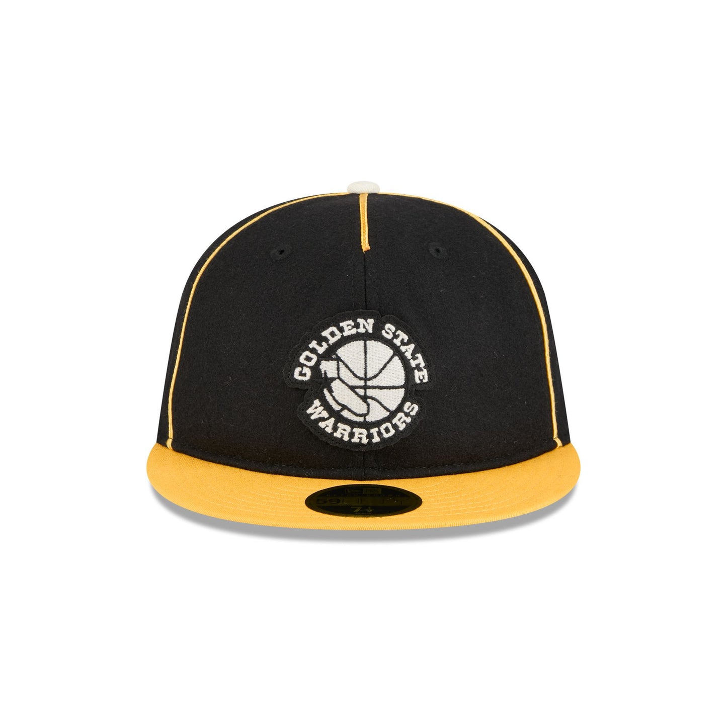 The Golden State Warriors Felt Logo Retro Crown 59FIFTY Fitted Cap features an embroidered Warriors Hardwood Classics felt logo at the front panels with the NBA Logoman at the right-wear side. Additional details include a team color piping at the crown and a green undervisor.