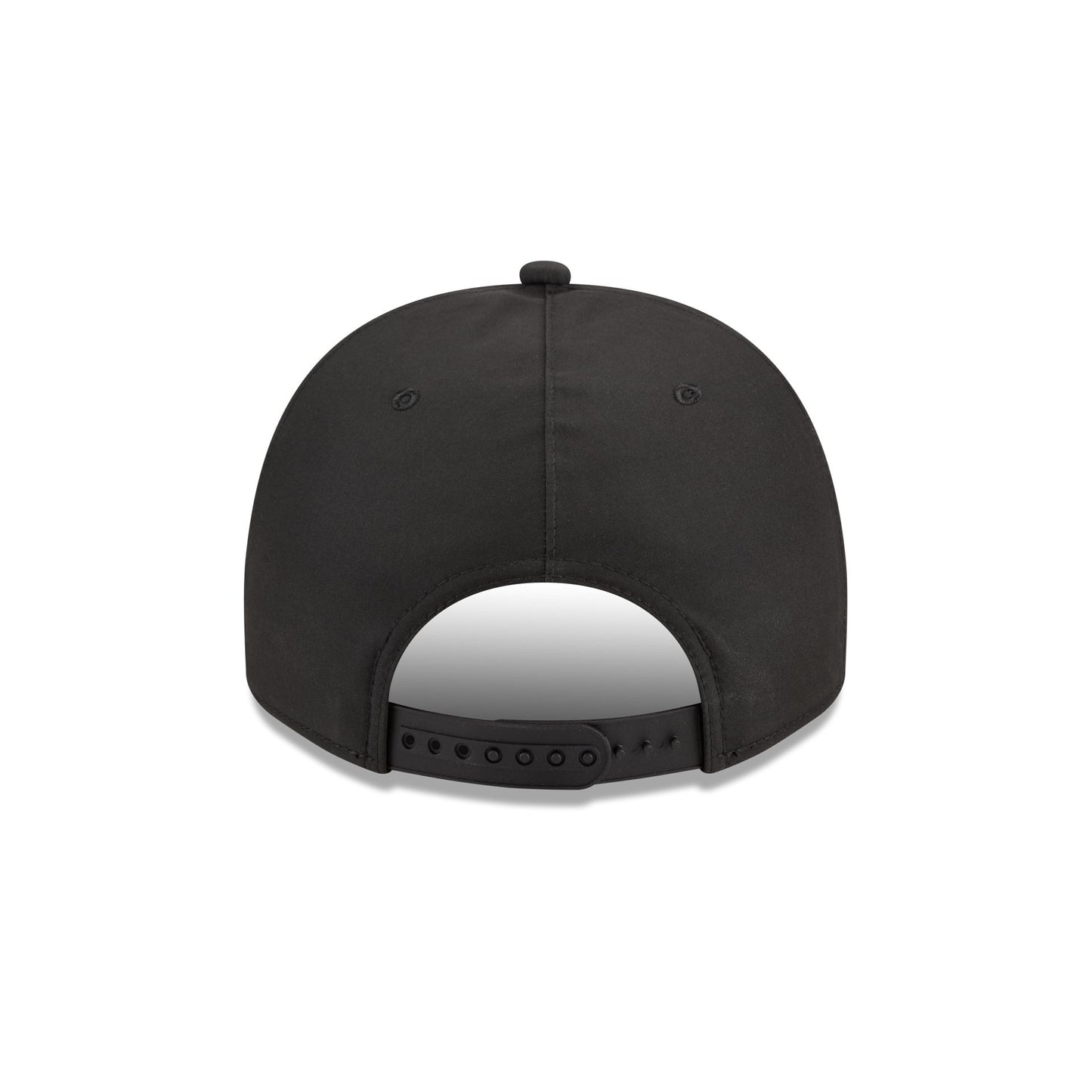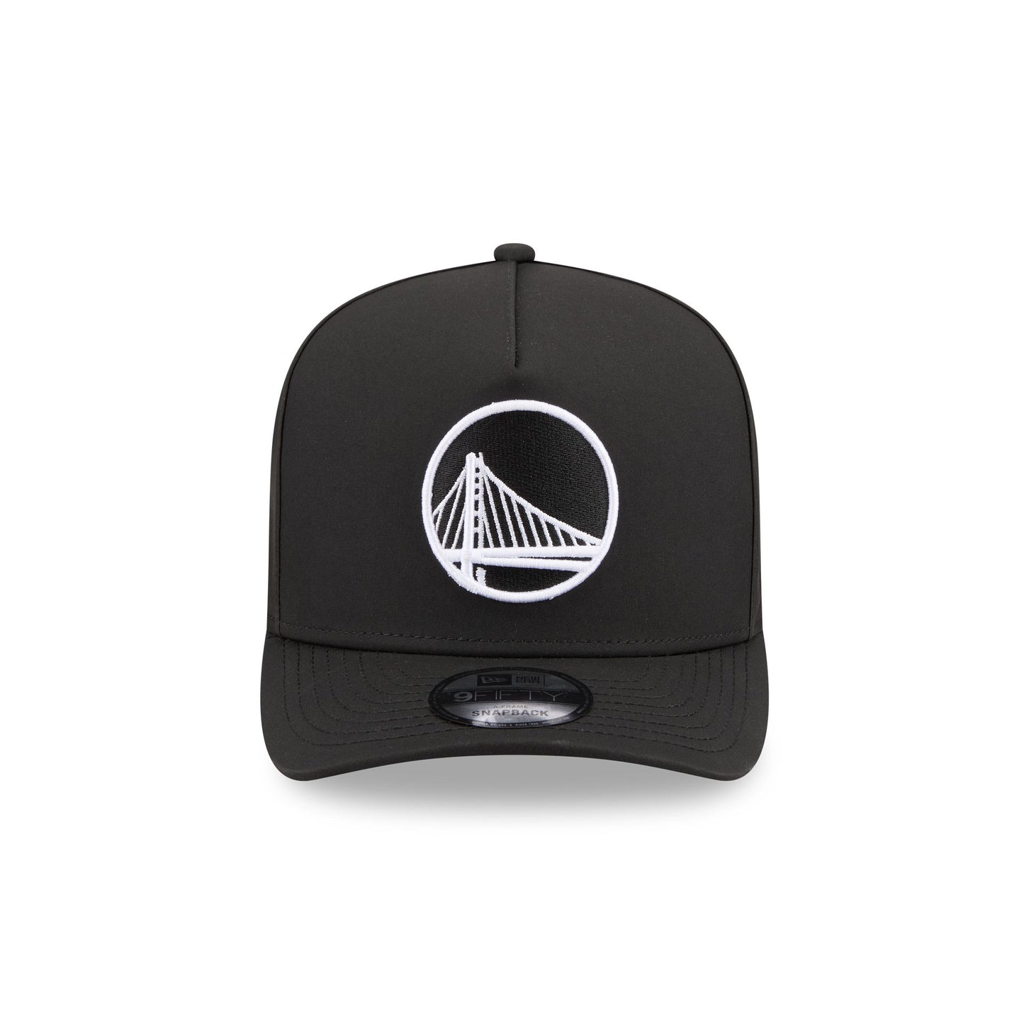 The Golden State Warriors GORE-TEX Black 9FIFTY A-Frame Snapback features an embroidered white Warriors logo at the front panels with a metallic sheen silicone New Era Flag logo and GORE-TEX logo at the left-wear side. Additional details include an adjustable snapback closure at the rear, a gray undervisor, and a polyester fabrication throughout the cap. It is waterproof, breathable, and lightweight.