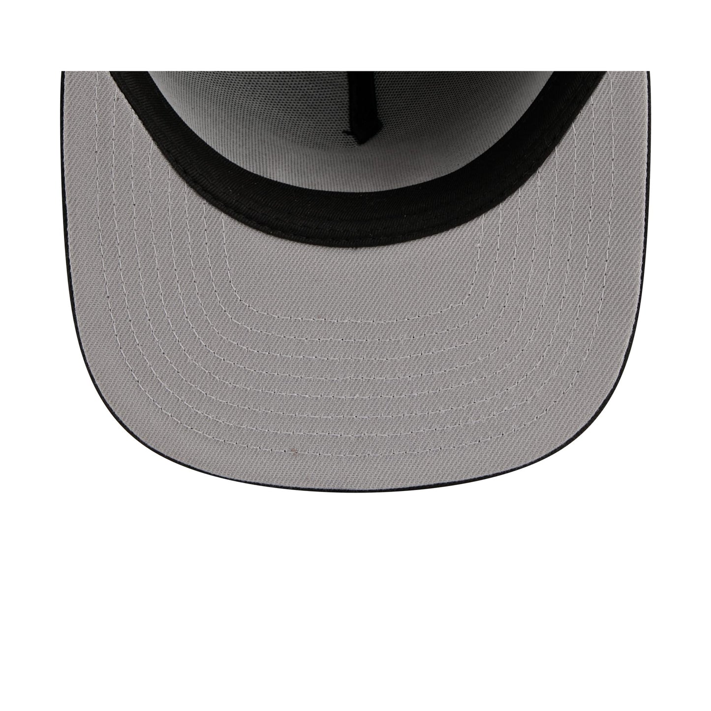 The Golden State Warriors Grunge Plaid 9FIFTY A-Frame Adjustable Cap features an embroidered Warriors logo at the front panel with a matching wordmark above an adjustable metal clasp closure at the rear, a black visor, and a gray undervisor.