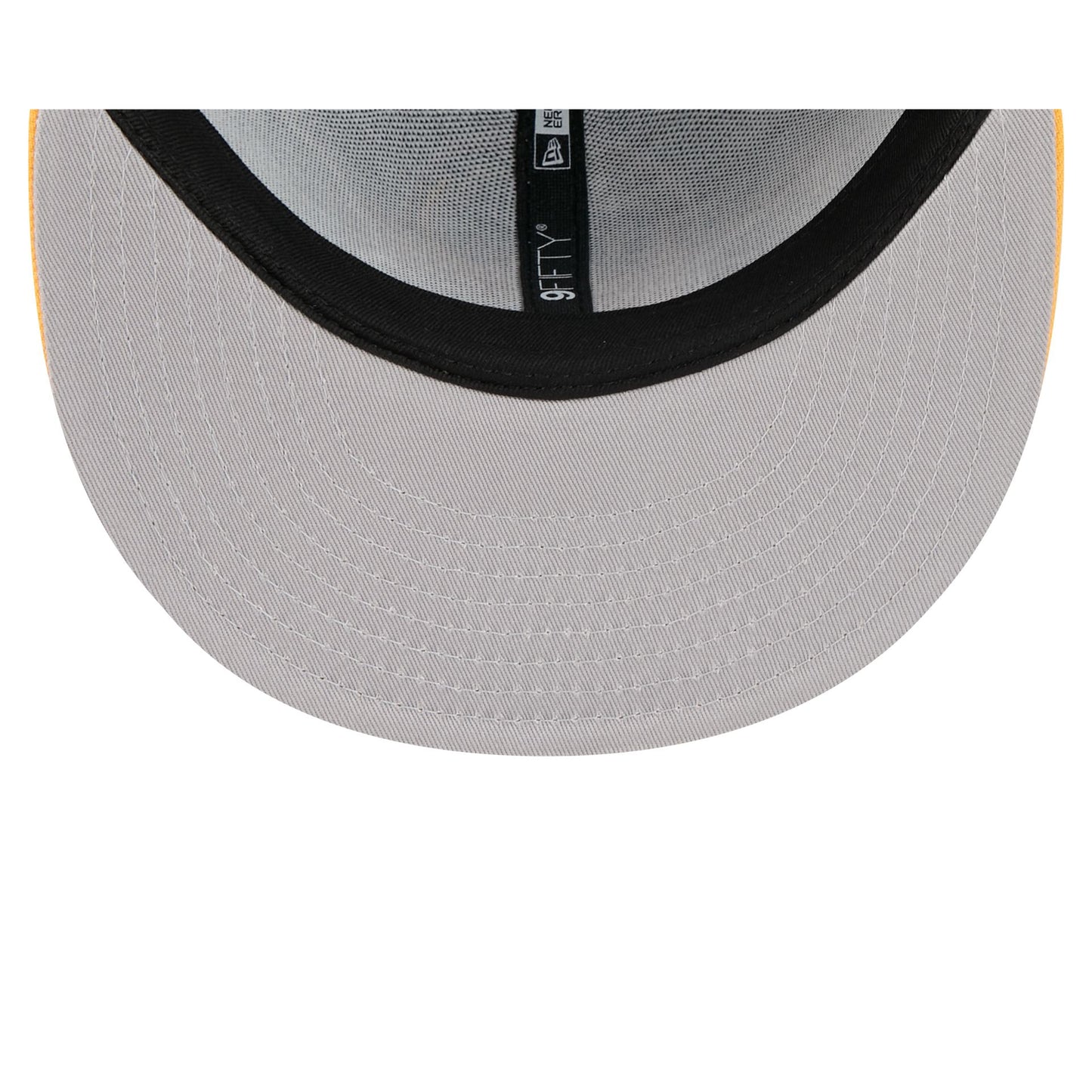 The Golden State Warriors Hardwood Classics All-Star Game 9FIFTY Snapback features an embroidered Warriors logo at the front panels with a matching NBA Logoman figure to the left and various team logos throughout the crown. Additional details include the NBA Logoman above an adjustable snapback closure at the rear and a gray undervisor.