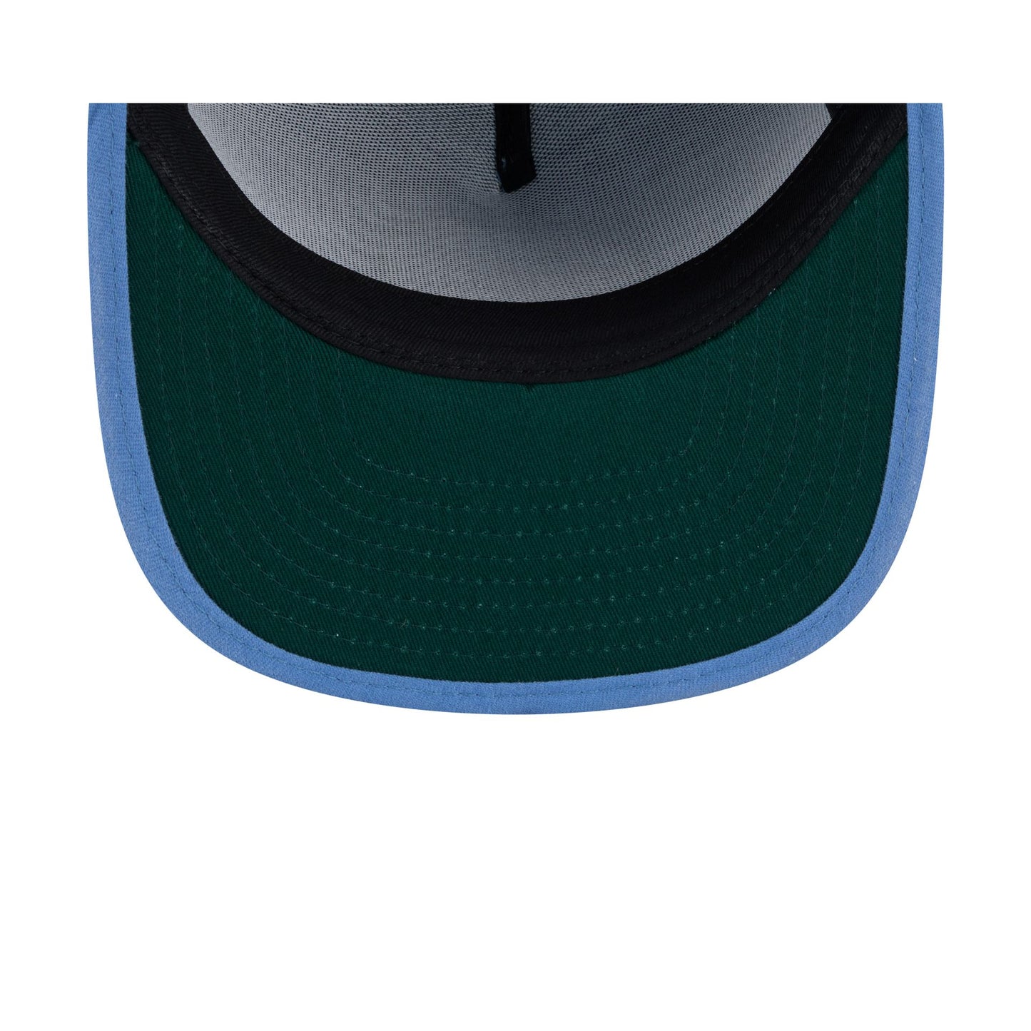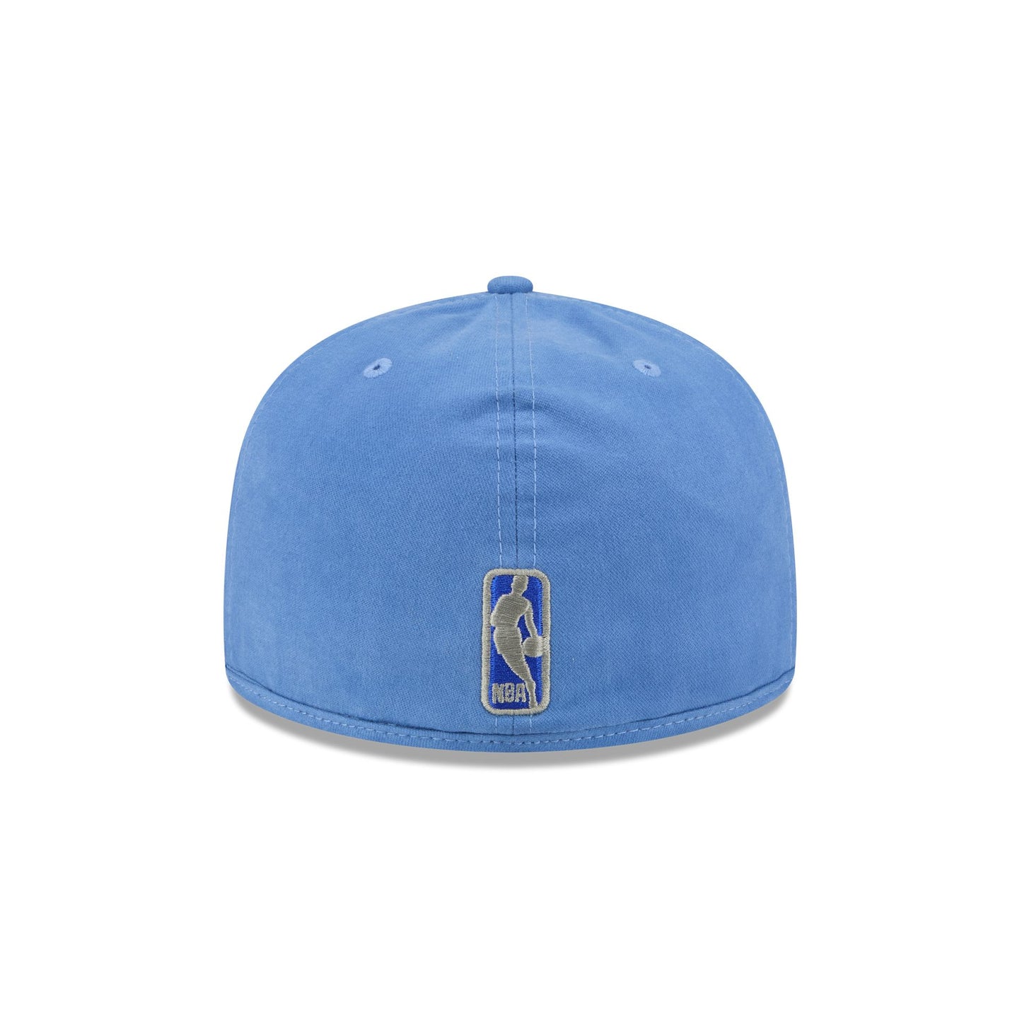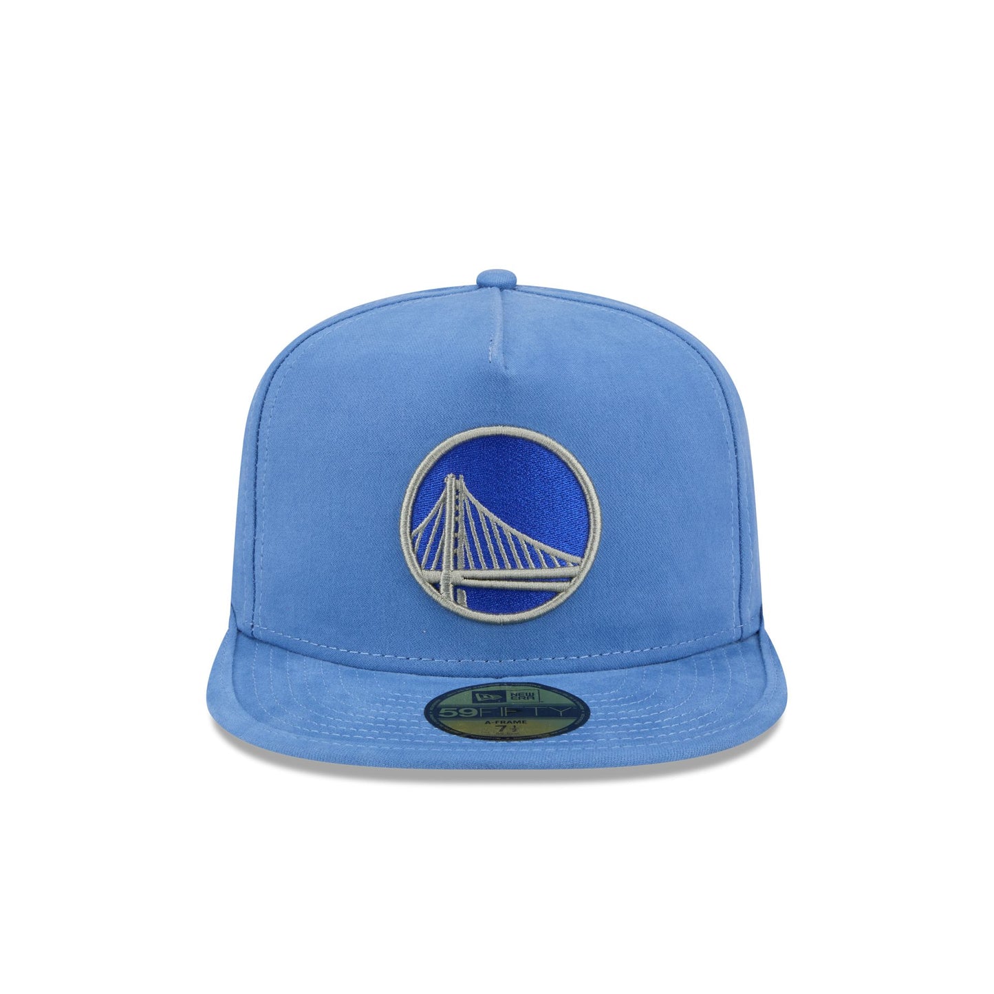 The Golden State Warriors Quilted 59FIFTY A-Frame Fitted Cap features an embroidered Warriors logo at the front panel with a matching NBA Logoman at the rear, a brushed cotton fabrication, and a green undervisor.