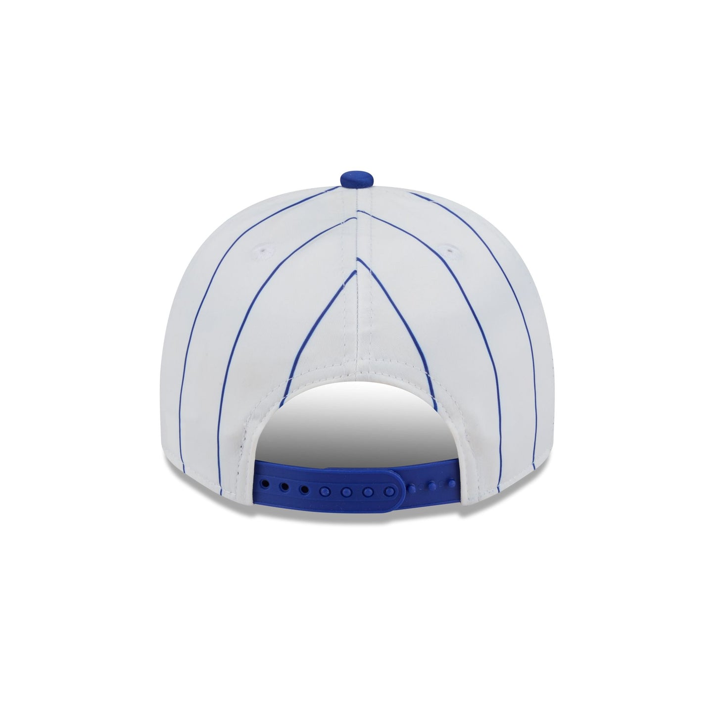The Golden State Warriors Satin Pinstripe 9FIFTY A-Frame Snapback features an embroidered Warriors logo at the front panel with a team color visor, a gray undervisor, and a snapback closure at the rear.