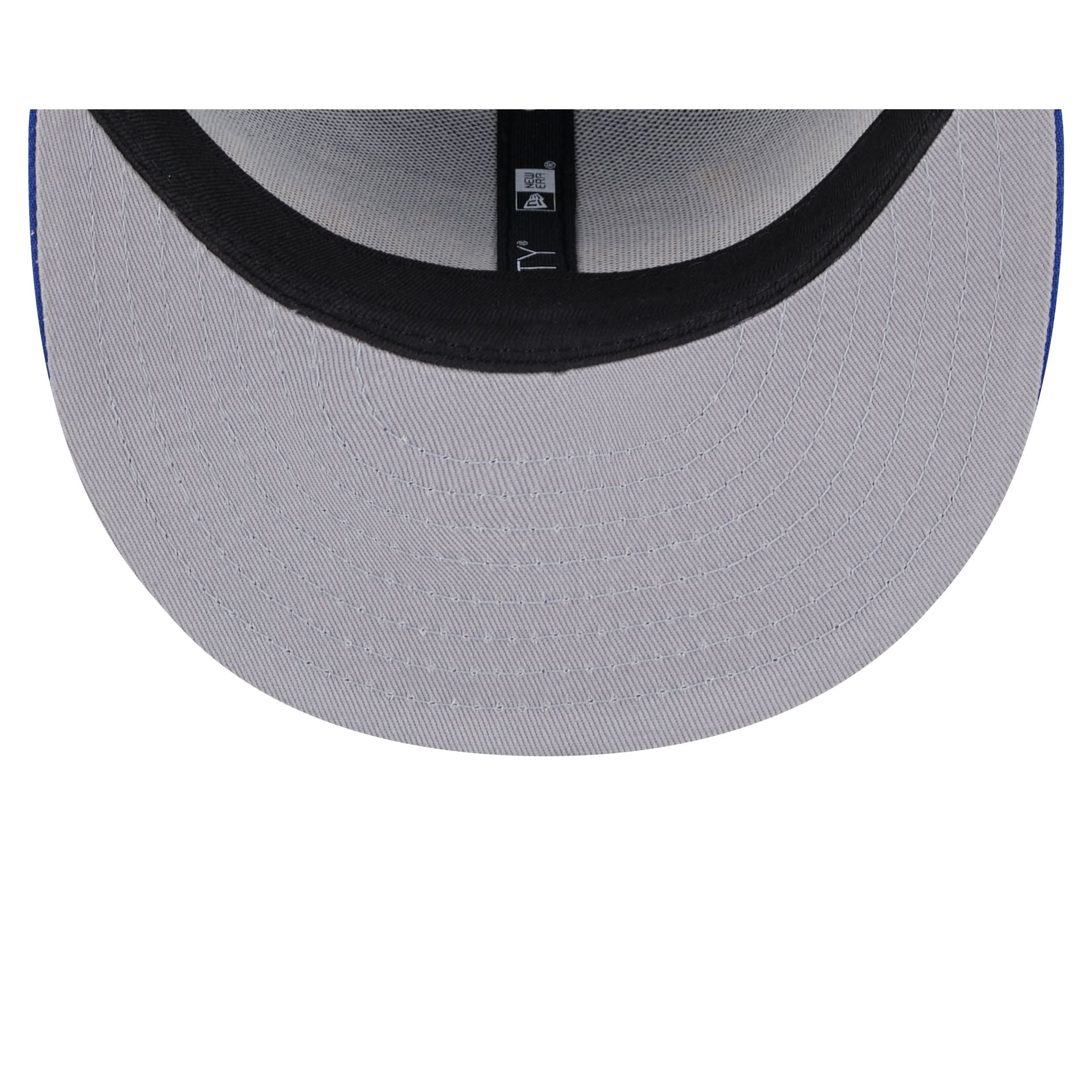The Golden State Warriors Kids 9FIFTY Snapback Hat features an embroidered Warriors wordmark at the front panels with a matching team logo at the right-wear side. Additional details include a gray undervisor and a snapback closure at the rear.