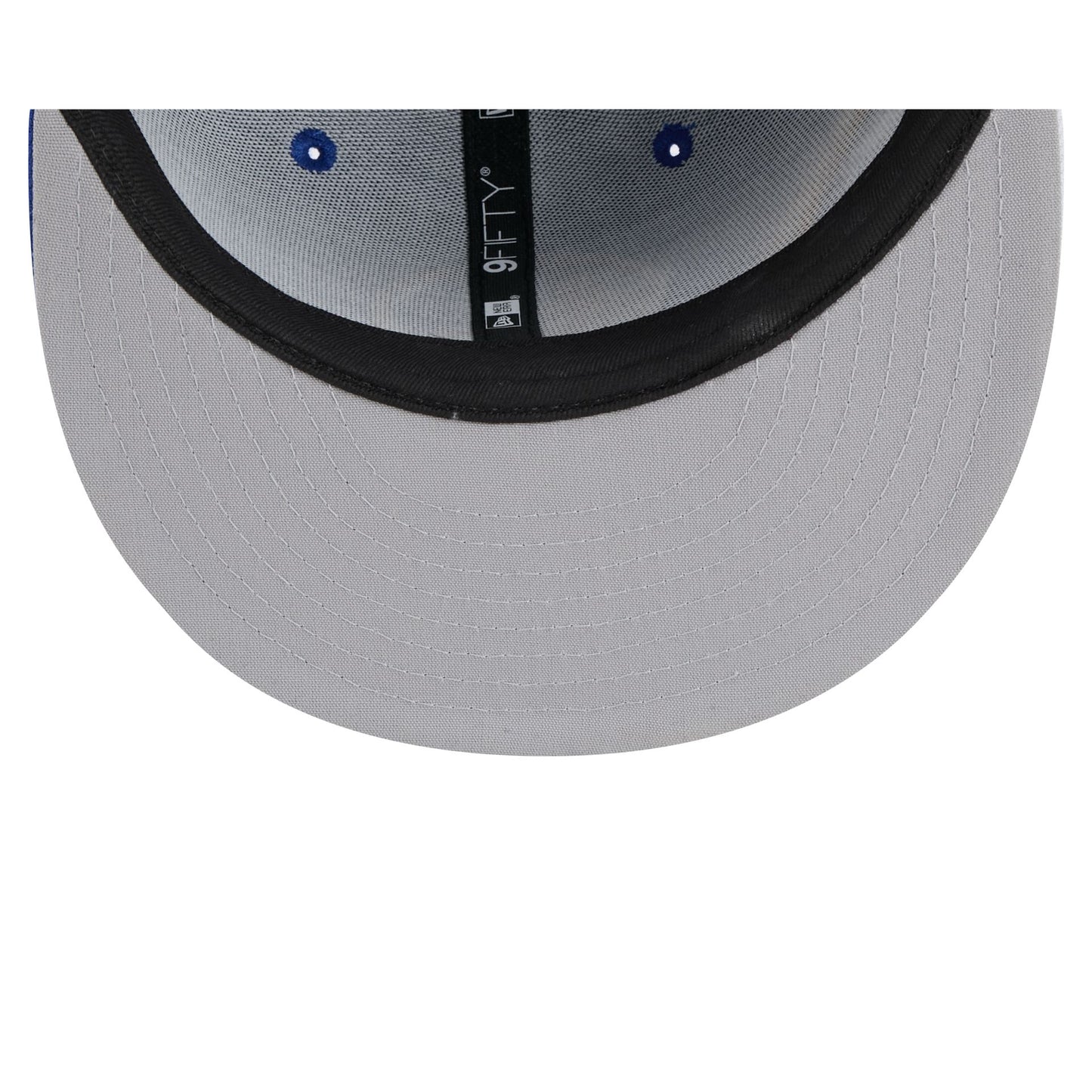 The Golden State Warriors Stephen Curry 9FIFTY Snapback features an embroidered Warriors logo at the front panels with the player's name and number at the right-wear side. Additional details include a snapback closure at the rear and a gray undervisor.