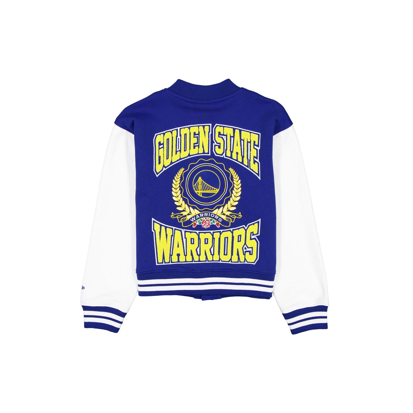 The Golden State Warriors Throwback Prep Women's Jacket features a chain-stitched Warriors script at the left chest with a snap front closure and a chenille applique wordmark with team emblem at the rear.