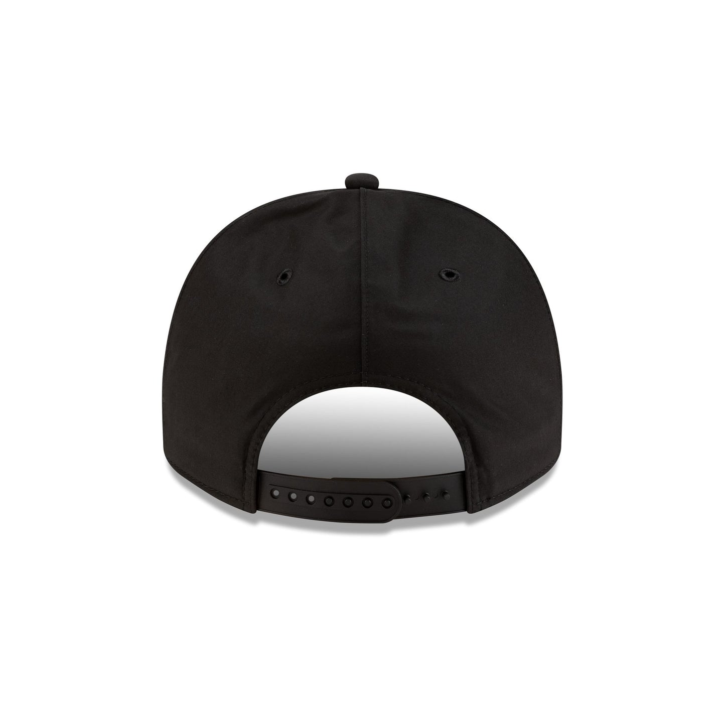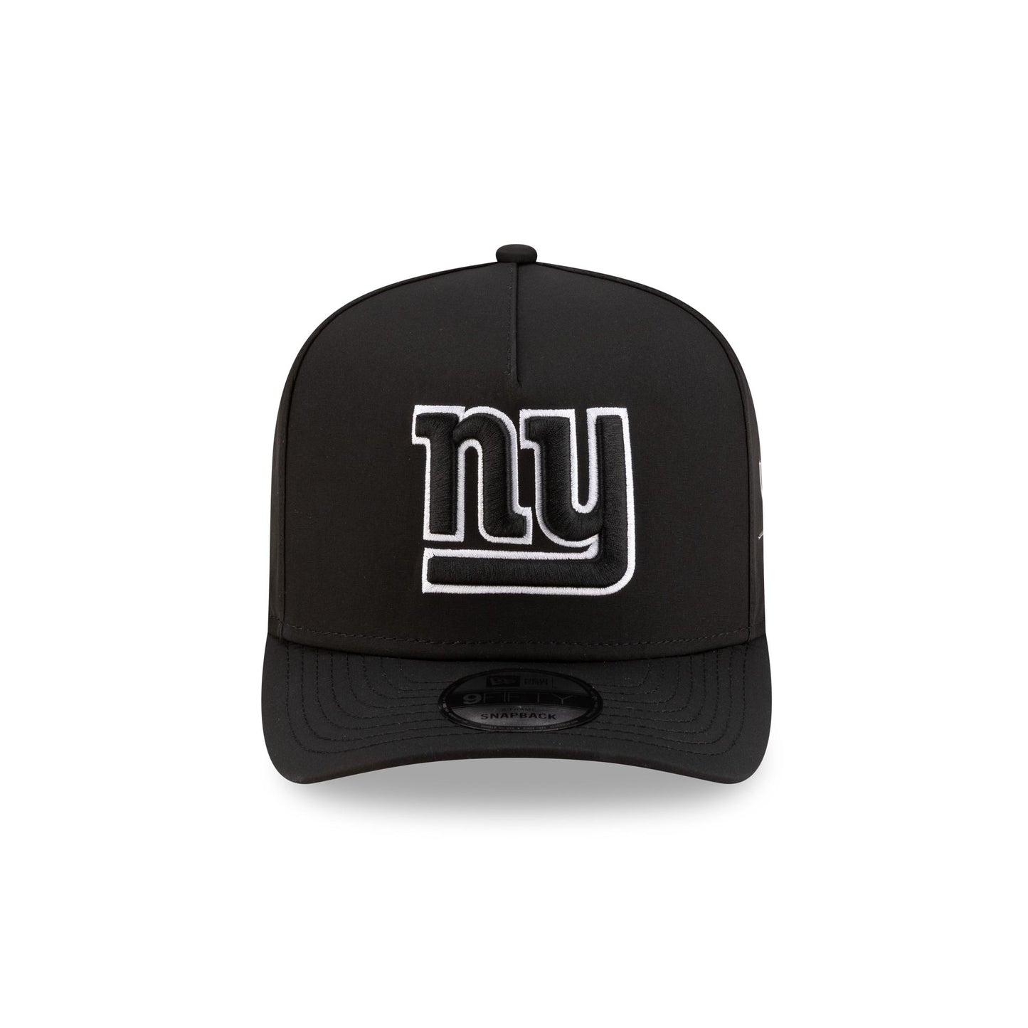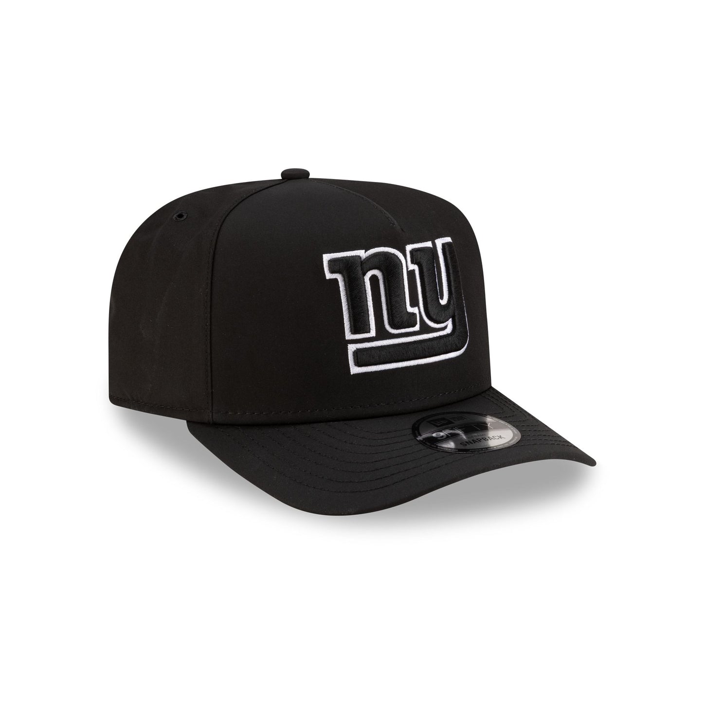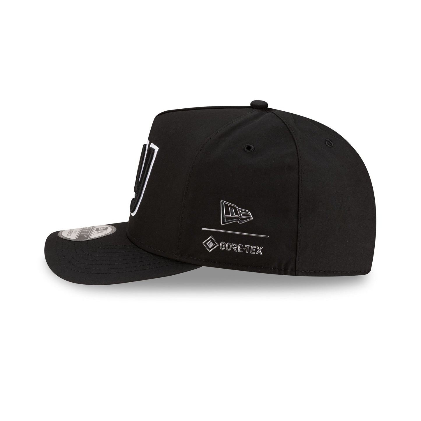 The GORE-TEX x New York Giants Black 9FIFTY A-Frame Snapback features an embroidered white Giants logo at the front panels with a metallic sheen silicone New Era Flag logo and GORE-TEX logo at the left-wear side. Additional details include an adjustable snapback closure at the rear, a gray undervisor, and a polyester fabrication throughout the cap. It is waterproof, breathable, and lightweight.
