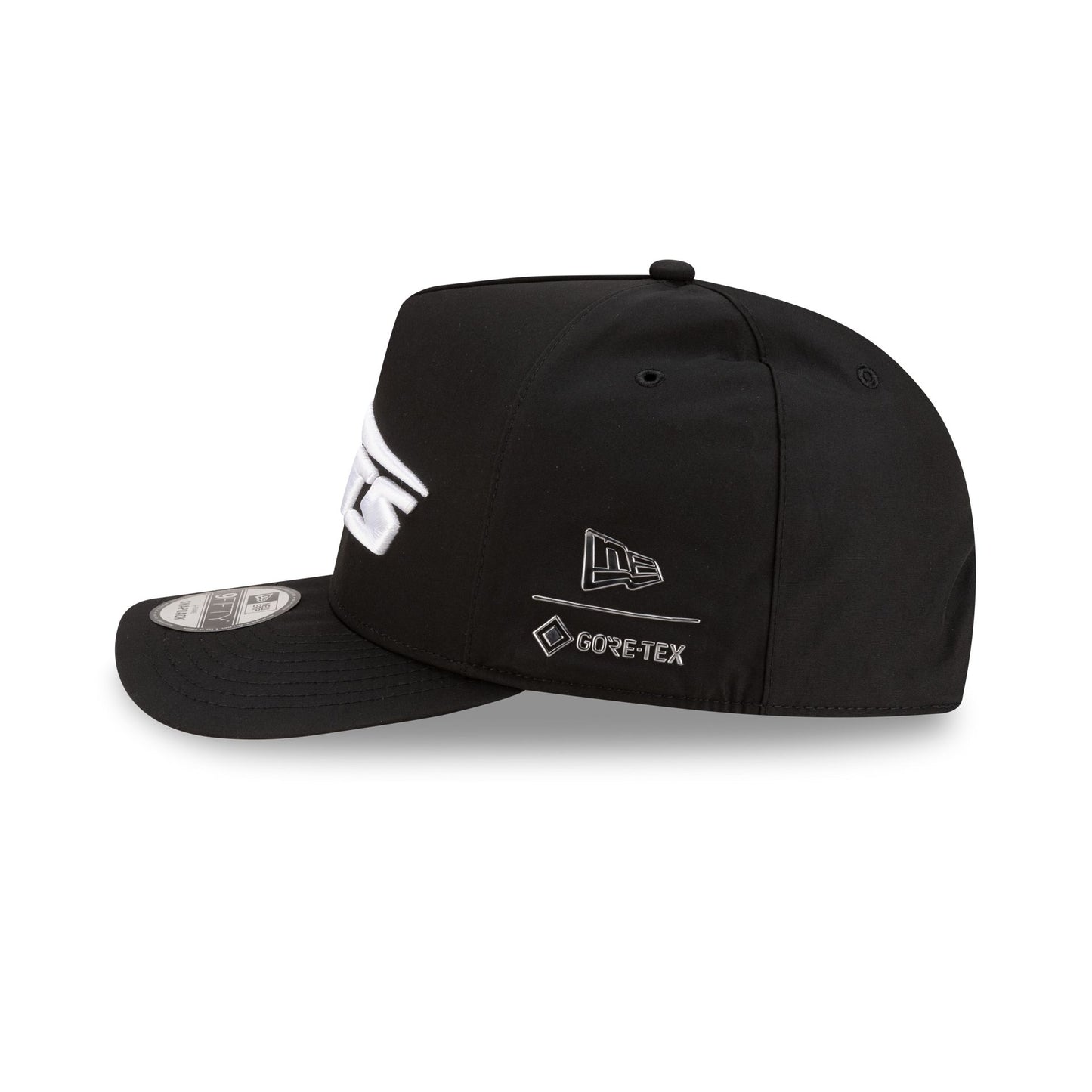 The GORE-TEX x New York Jets Black 9FIFTY A-Frame Snapback features an embroidered white Jets logo at the front panels with a metallic sheen silicone New Era Flag logo and GORE-TEX logo at the left-wear side. Additional details include an adjustable snapback closure at the rear, a gray undervisor, and a polyester fabrication throughout the cap. It is waterproof, breathable, and lightweight.