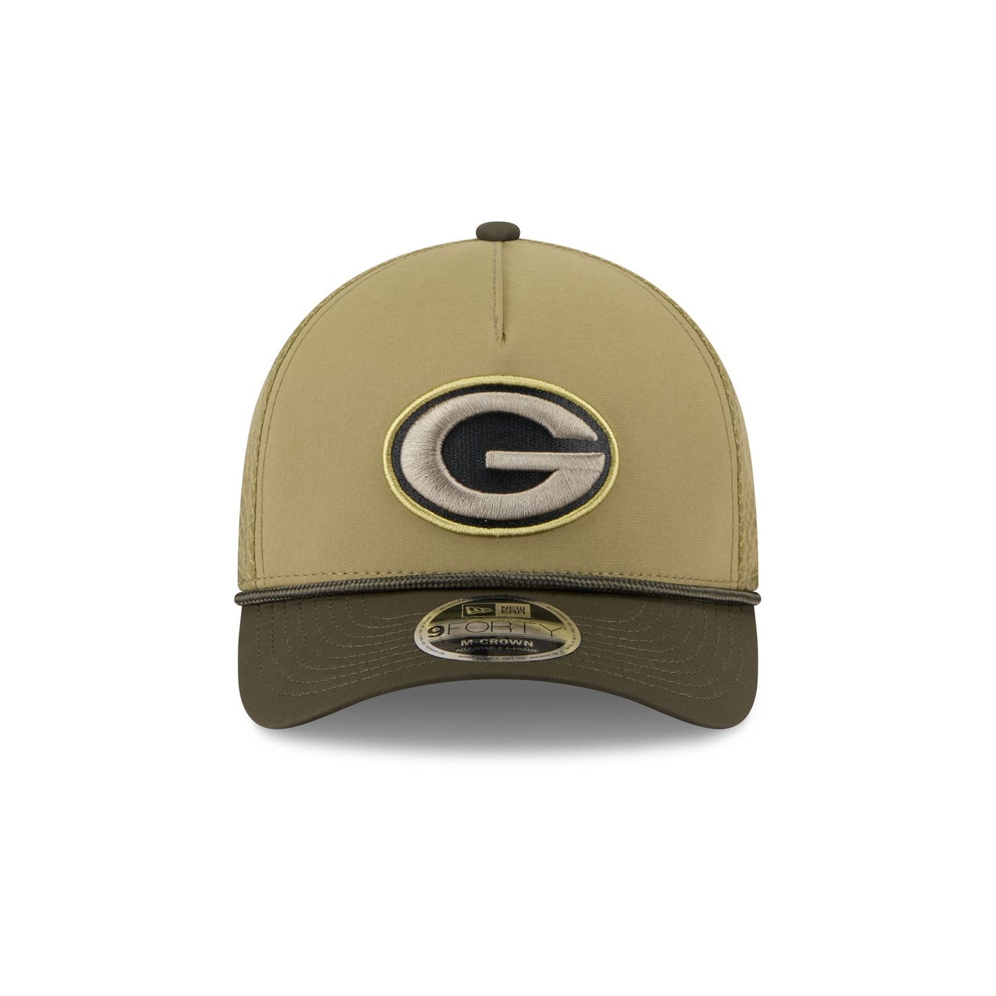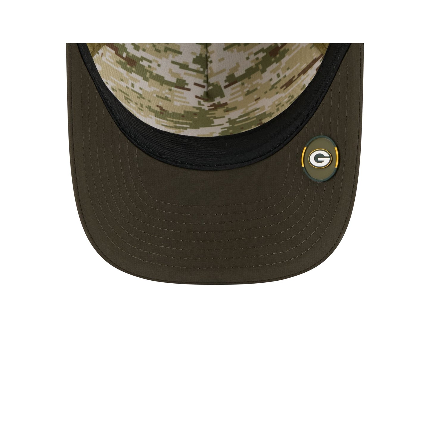 The Green Bay Packers 2025 Salute to Service 9FORTY M-Crown A-Frame Trucker features an embroidered Packers logo at the front panel with the official NFL Salute to Service patch above a snapback closure at the rear. Additional details include an American flag patch at the right-wear side with a silicone team logo patch at a dark green undervisor and a digi camo interior fabrication.