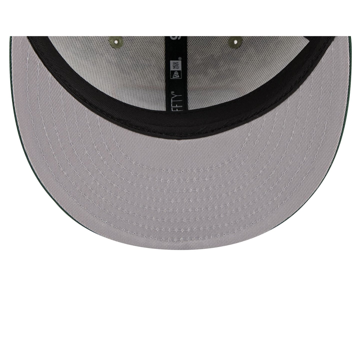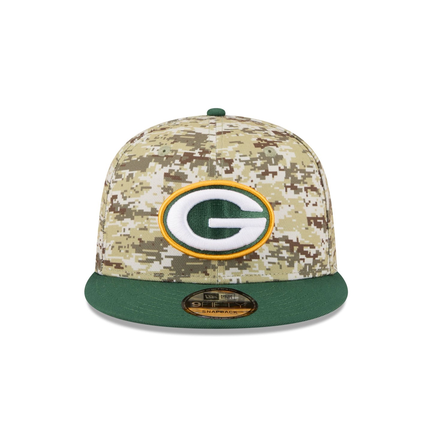 The Green Bay Packers 2025 Salute to Service Fan Gear 9FIFTY Snapback features an embroidered Packers logo at the front panels with the official NFL Salute to Service patch above a snapback closure at the rear. Additional details include an American flag patch at the right-wear side with team color visor and a gray undervisor.