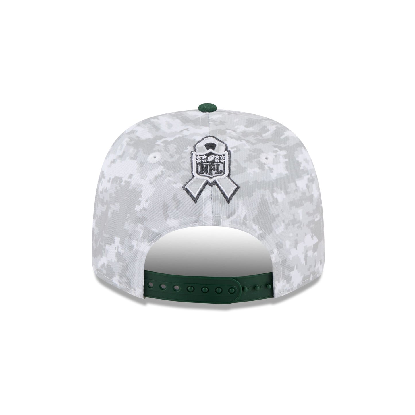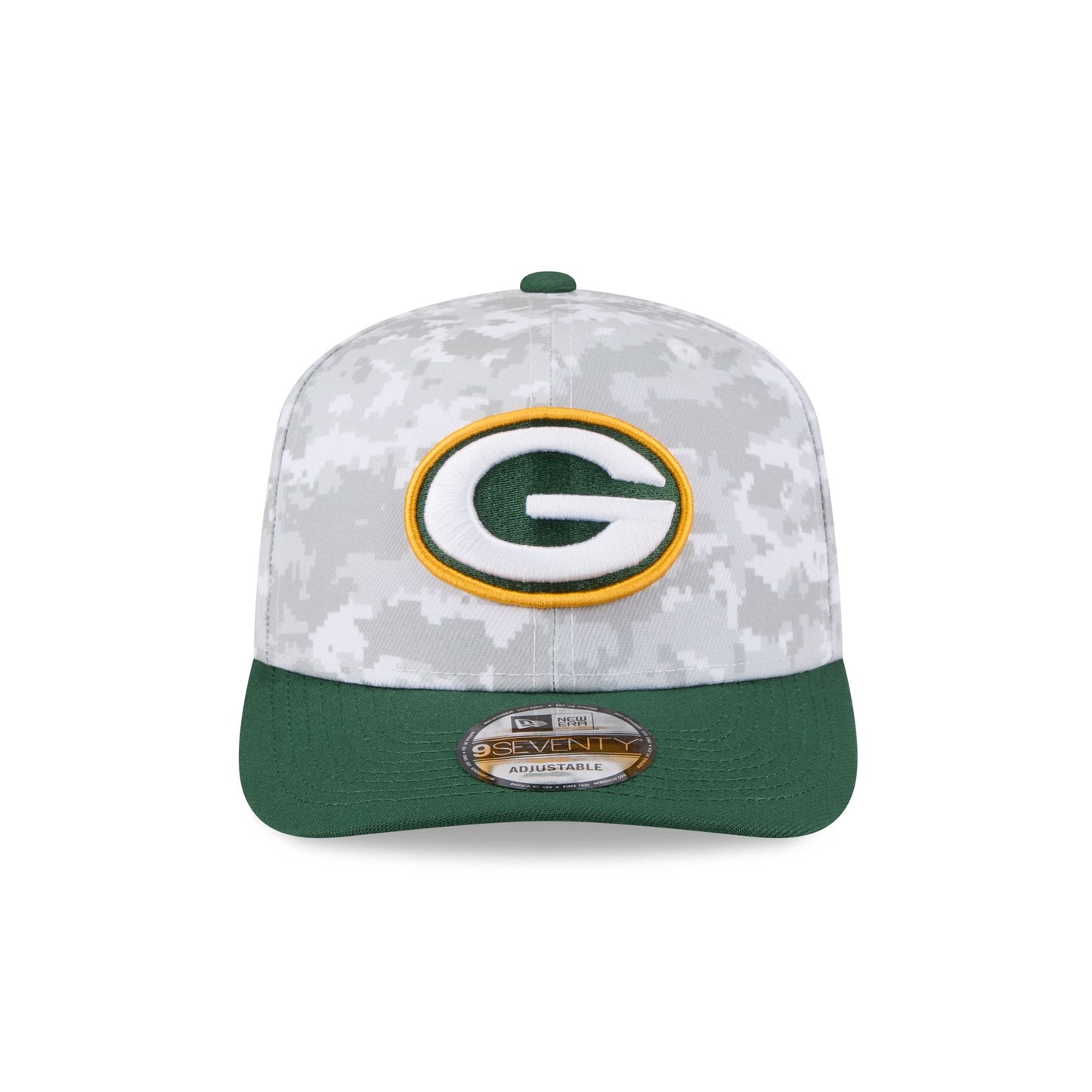 The Green Bay Packers 2025 Salute to Service Fan Gear 9SEVENTY Stretch-Snap Cap features an embroidered Packers logo at the front panels with the official NFL Salute to Service patch above a snapback closure at the rear, an American flag patch at the right-wear side, and a team color visor.