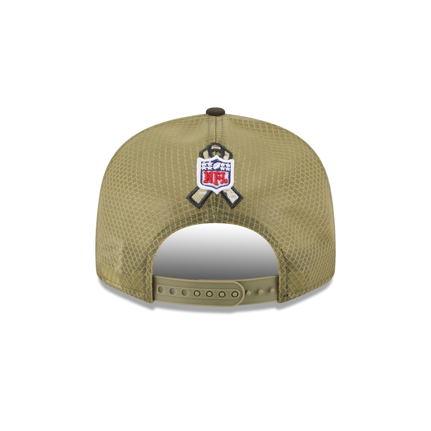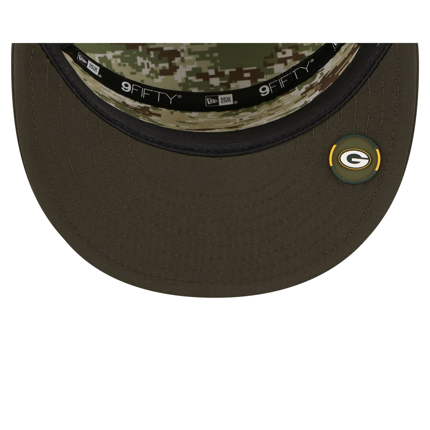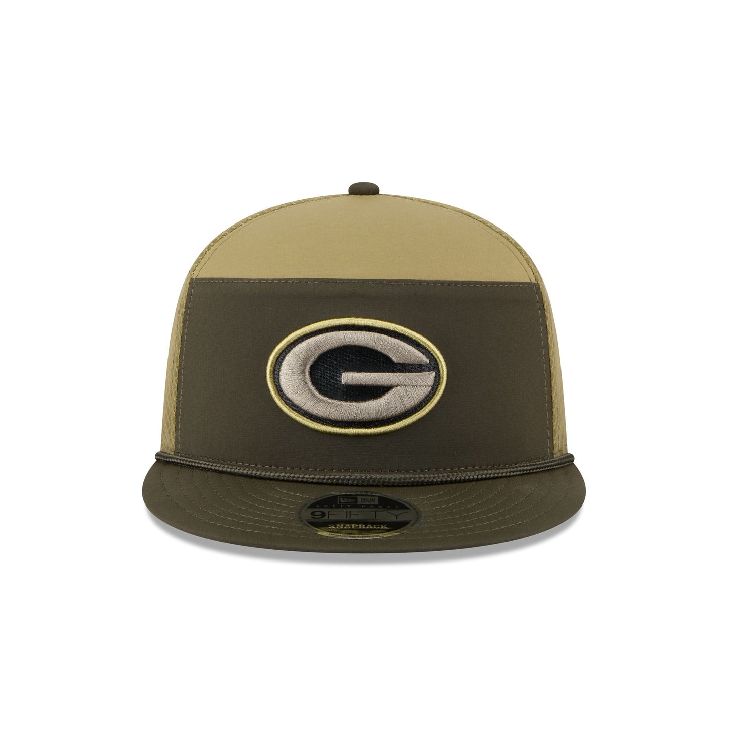 The Green Bay Packers 2025 Salute to Service Split Panel 9FIFTY Trucker features an embroidered Packers logo at the front panels with the official NFL Salute to Service patch above a snapback closure at the rear. Additional details include an American flag patch at the right-wear side with a silicone team logo patch at a dark green undervisor and a digi camo interior fabrication.