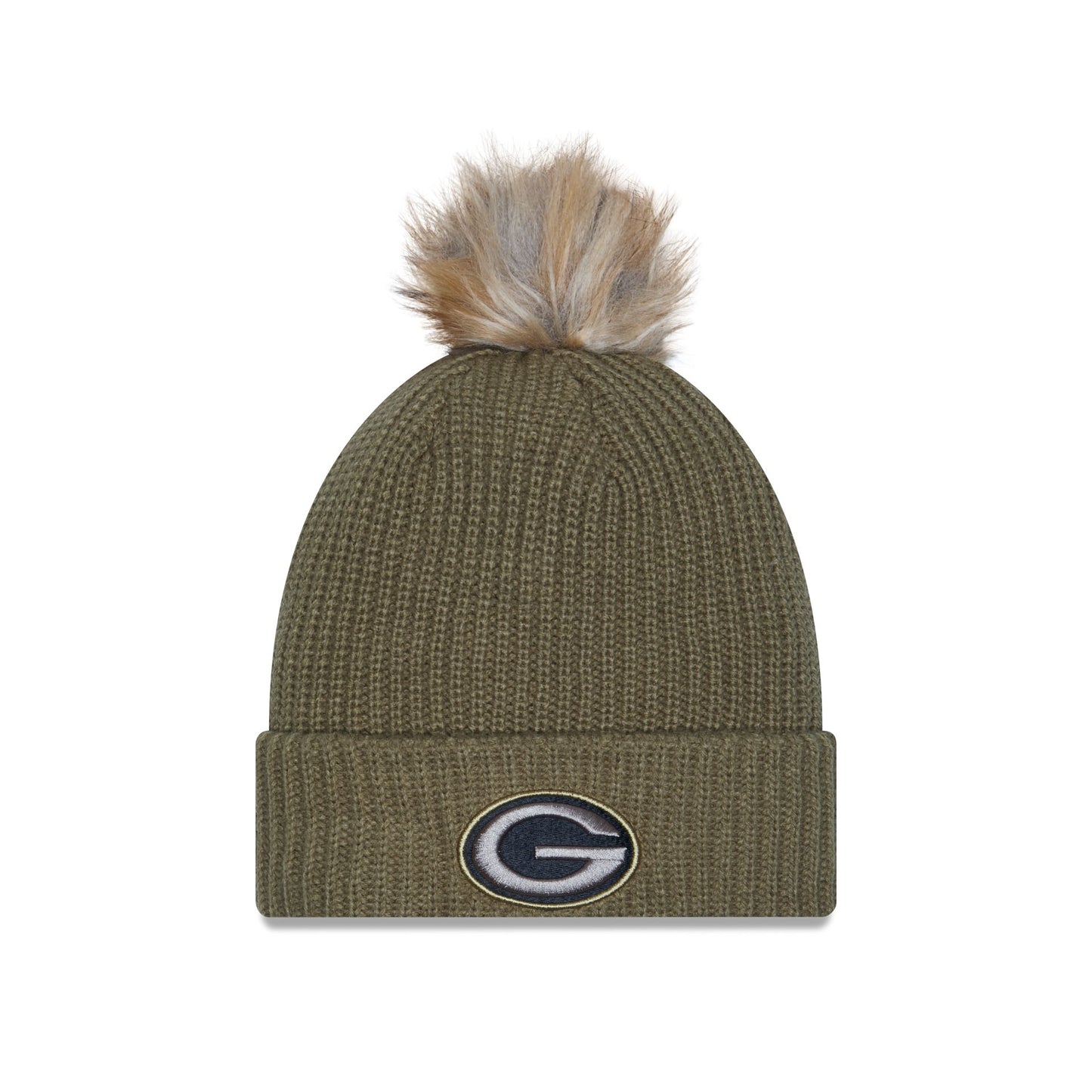 The Green Bay Packers 2025 Salute to Service Women's Pom Knit features an embroidered Packers logo at the front with an American flag patch at the right-wear side, the official NFL Salute to Service patch at the rear, and a one-time removeable pom.