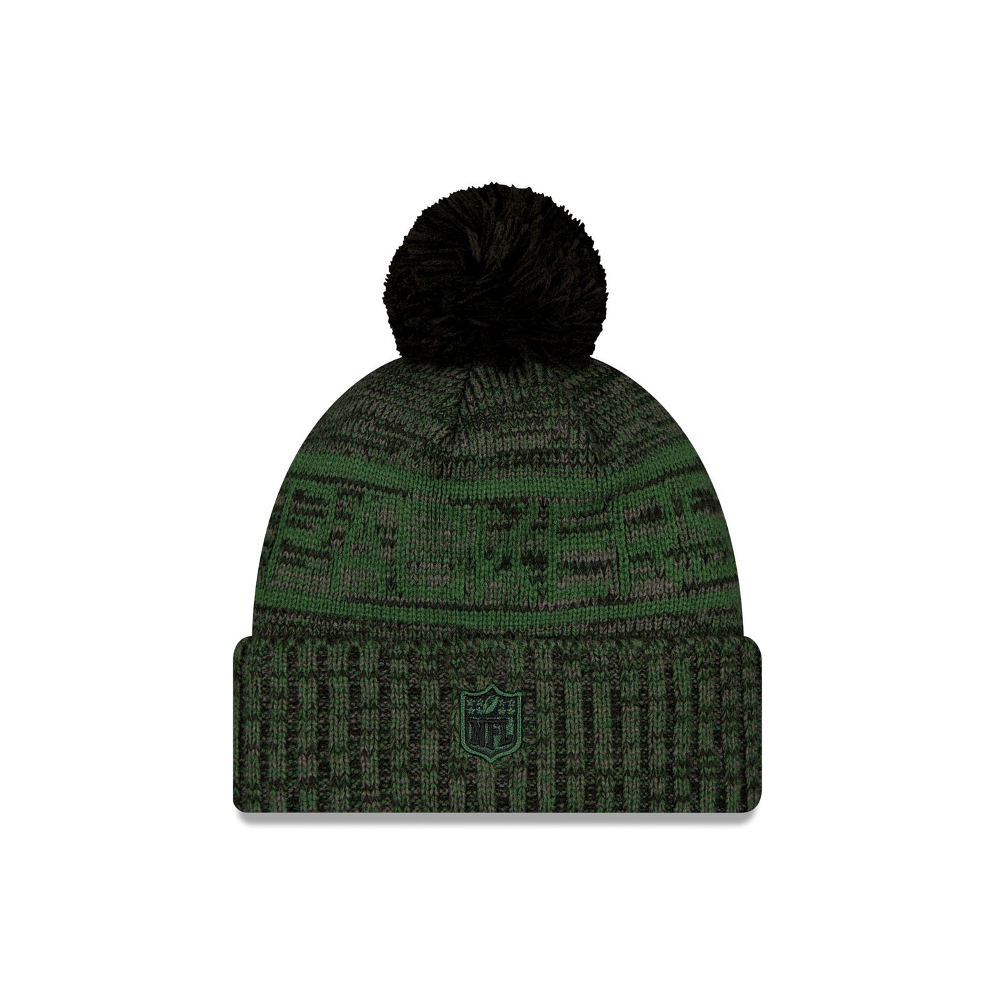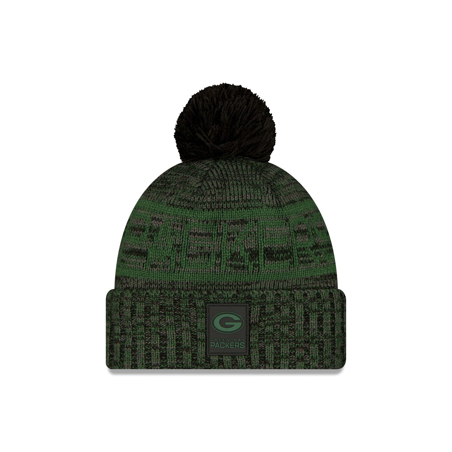 The Green Bay Packers 2025 Sideline Cold Weather Black Pom Knit Hat features a sewn-down silicone Packers black logo patch at the front cuff with a matching Official NFL Shield logo at the rear. Additional details include a team wordmark across the crown, a one-time removeable black pom, and a fleece lining.