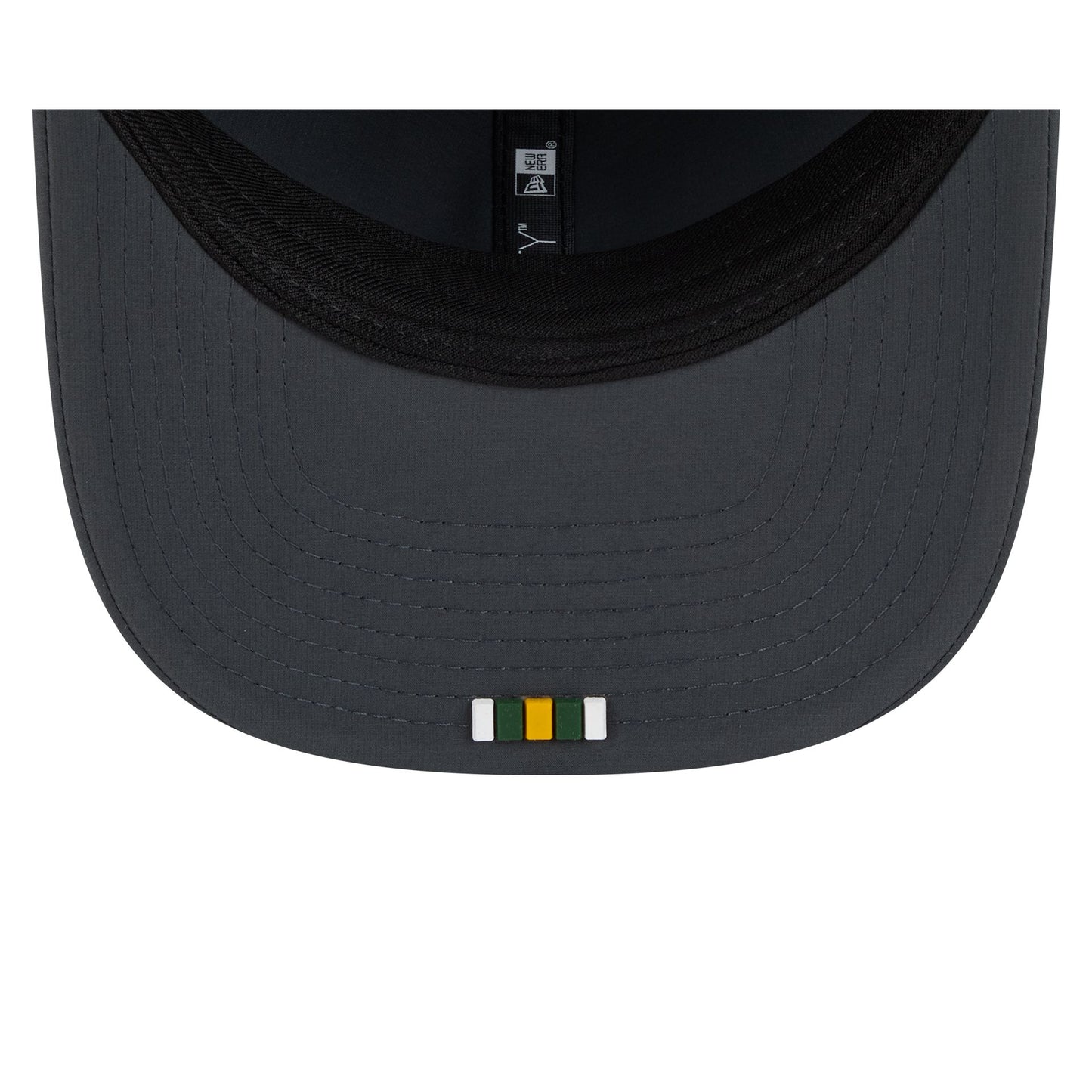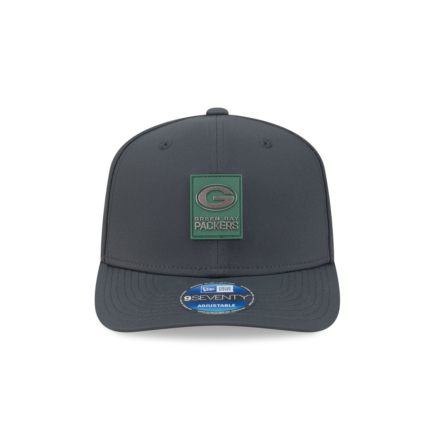 The Green Bay Packers 2025 Sideline Cold Weather Steel Clouds 9SEVENTY Stretch-Snap features a sewn-down silicone Packers logo patch at the front panels with a water-repellent quill tech fabrication throughout and an insulated crown with a quick-dry cushioned sweatband. Additional details include the Official NFL Shield logo to the right of a soft silicone snapback closure at the rear. The undervisor is accented with a silicone transfer in the team’s colors.