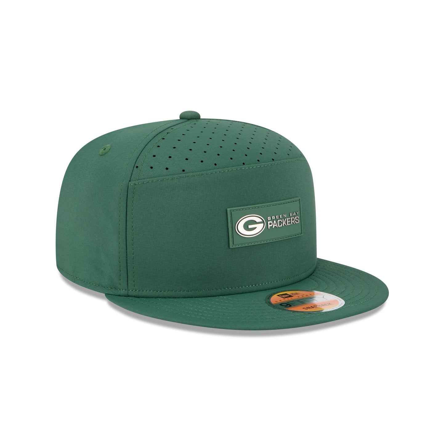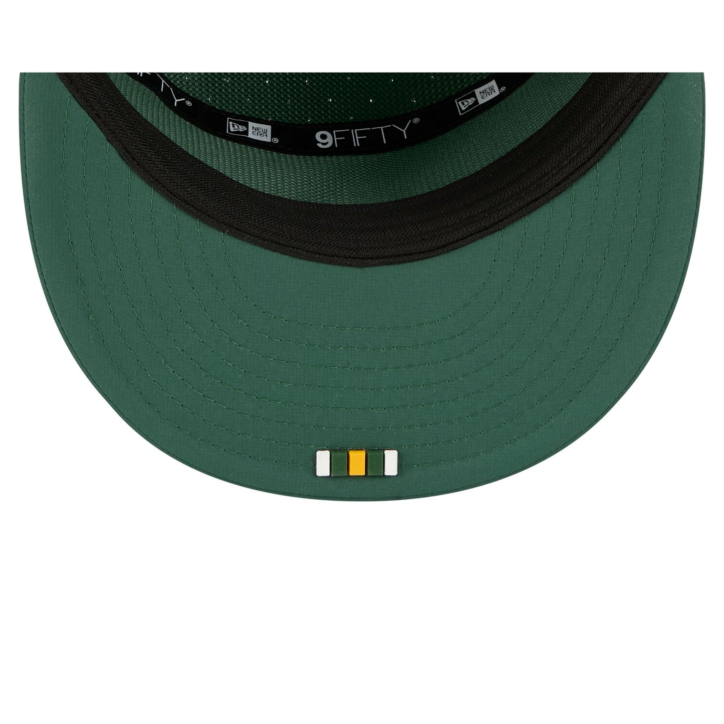 The Green Bay Packers 2025 Sideline Hot Weather Split Panel 9FIFTY Snapback features a sewn-down silicone Packers logo patch at the front panels with a split-crown construction. The cap has a water-repellent quill tech fabrication throughout, with a quick-dry cushioned sweatband to absorb moisture. Additional details include the Official NFL Shield logo to the right of a soft silicone snapback closure at the rear. The undervisor is accented with a silicone transfer in the team’s colors.