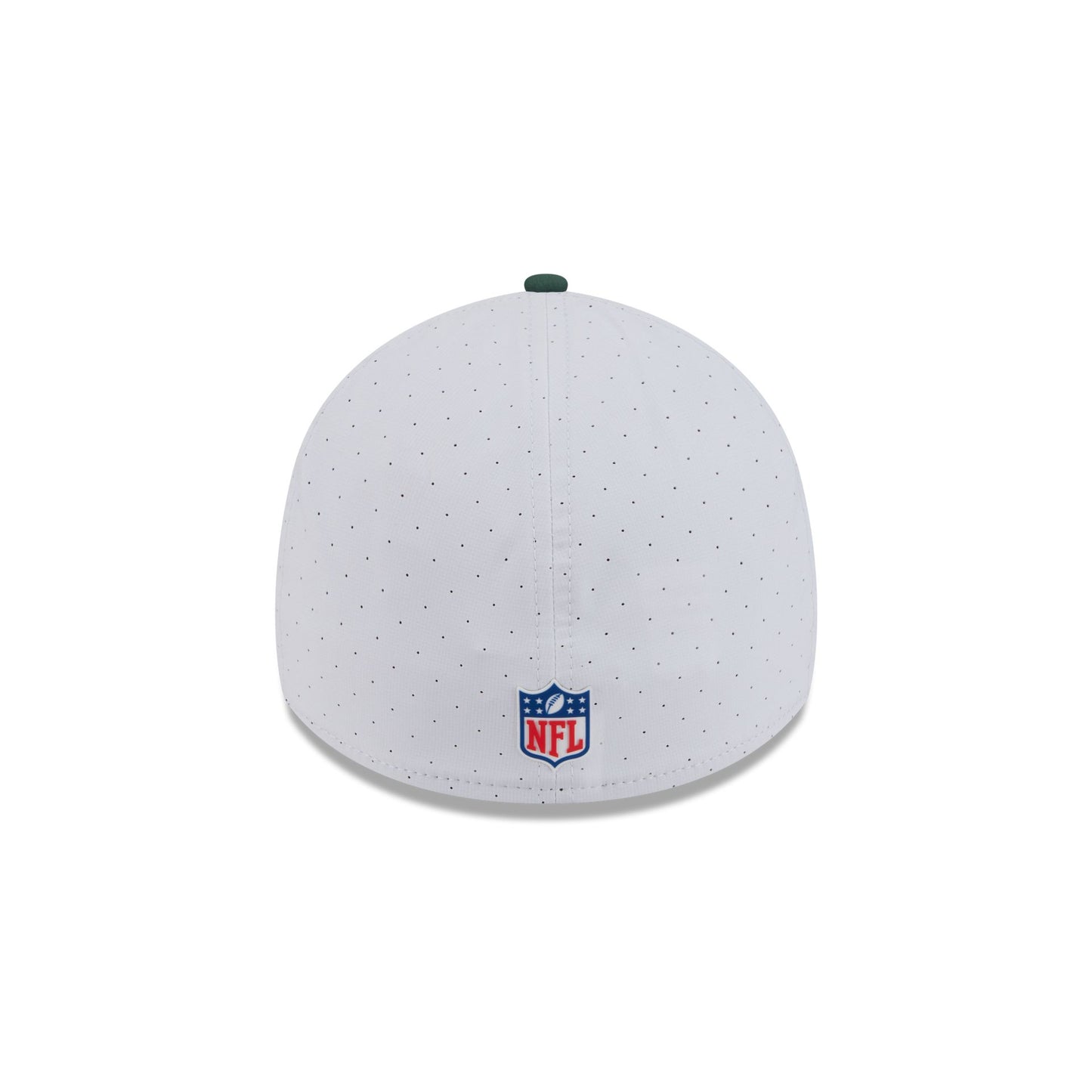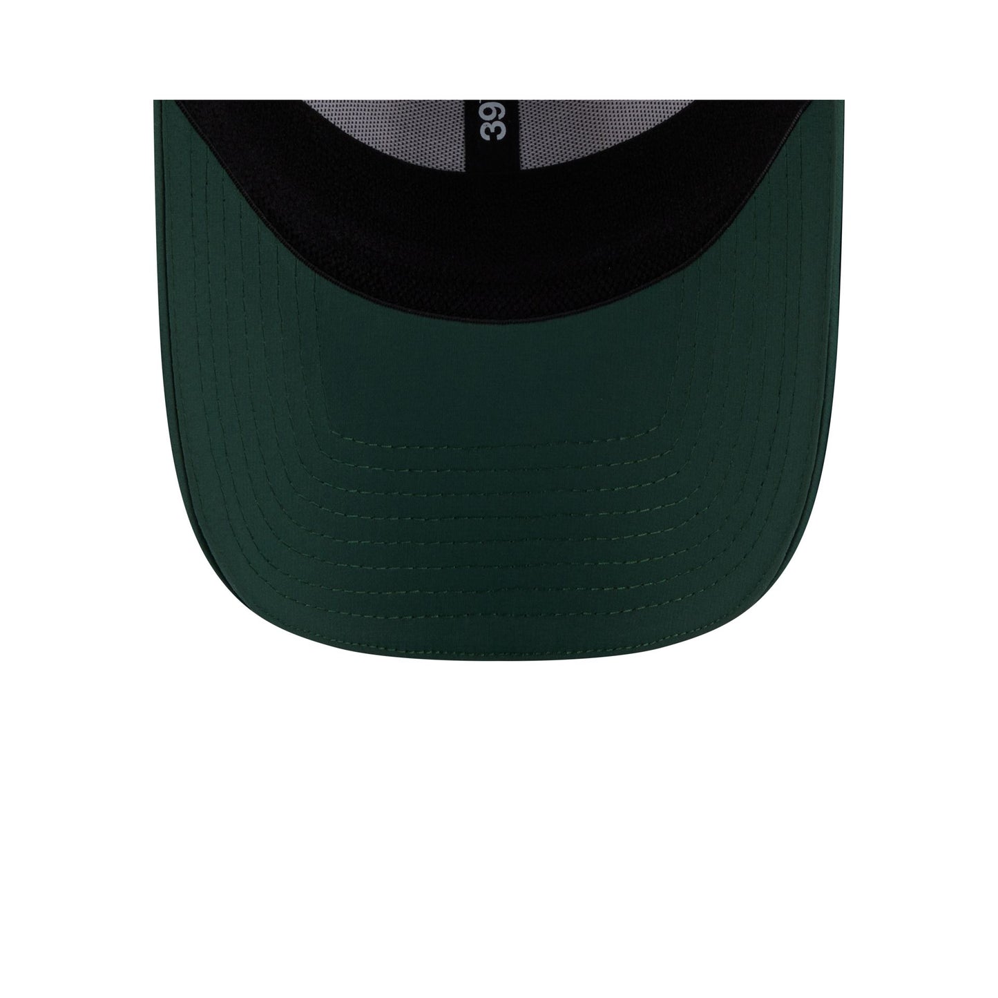The Green Bay Packers 2025 Training 39THIRTY Stretch Fit Cap features a silicone Packers patch at the front panels with team color stripes at the front of a green visor and a silicone NFL Shield patch at the rear.