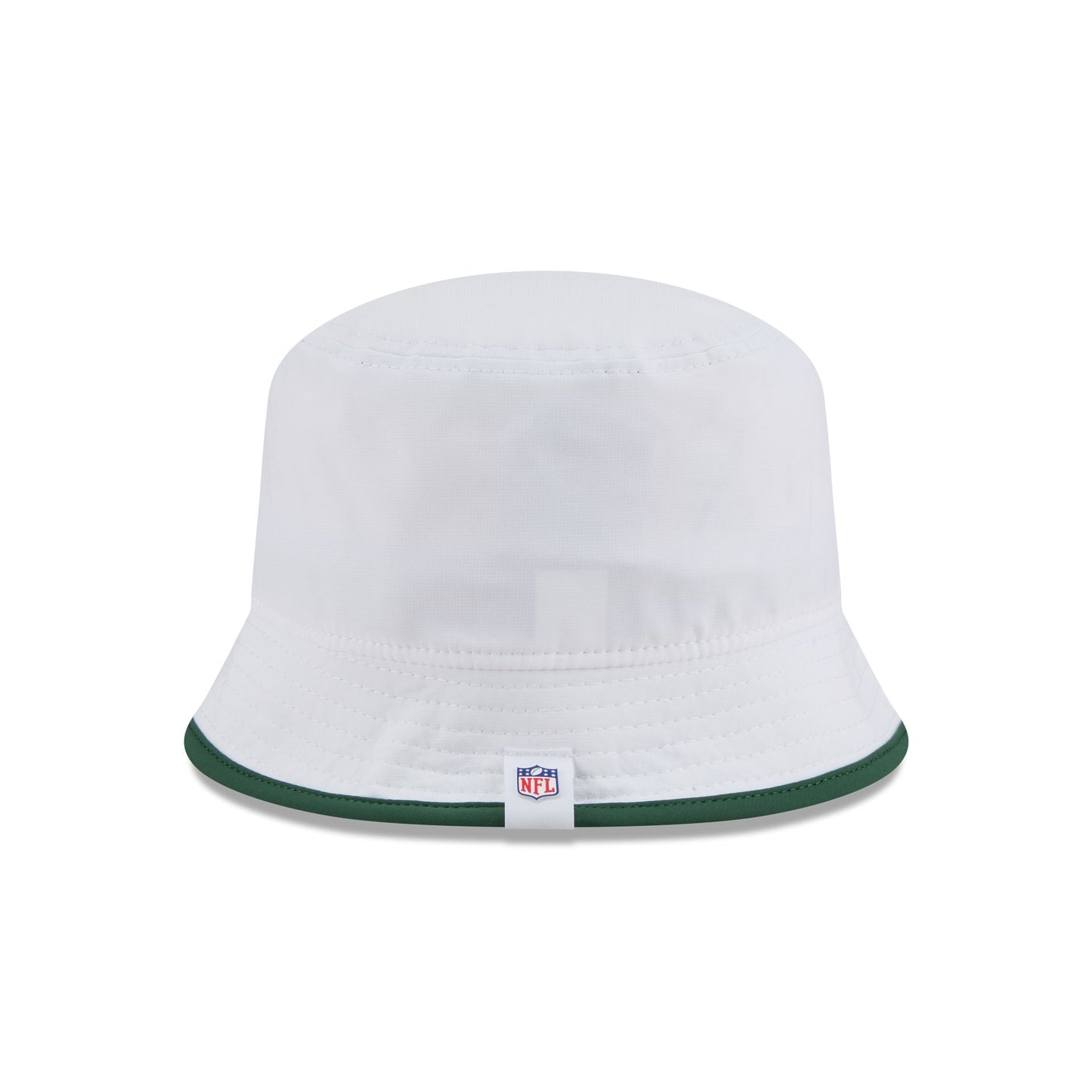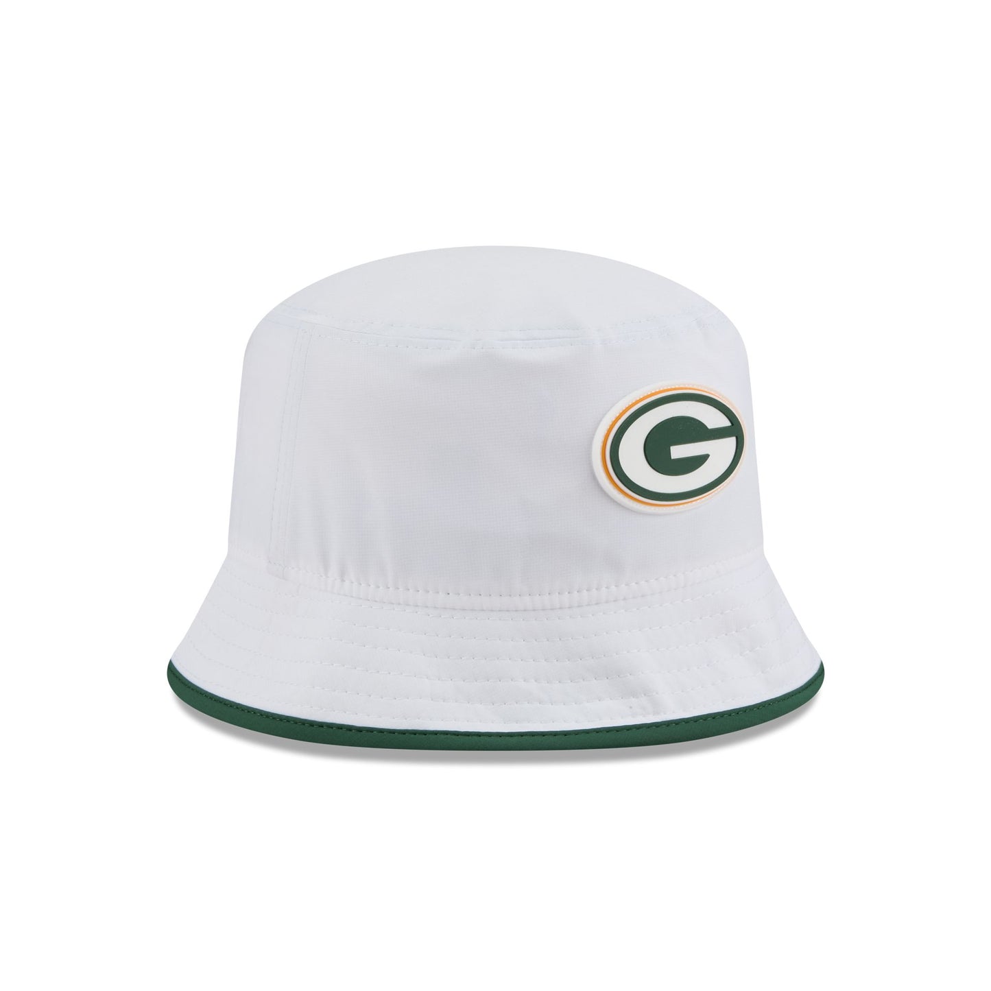 The Green Bay Packers 2025 Training Bucket Hat features a silicone Packers patch at the front panel with team color piping along the edge and a silicone NFL Shield patch on a woven foldover tab at the rear.