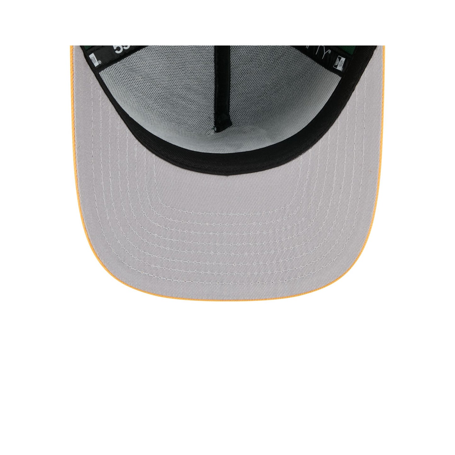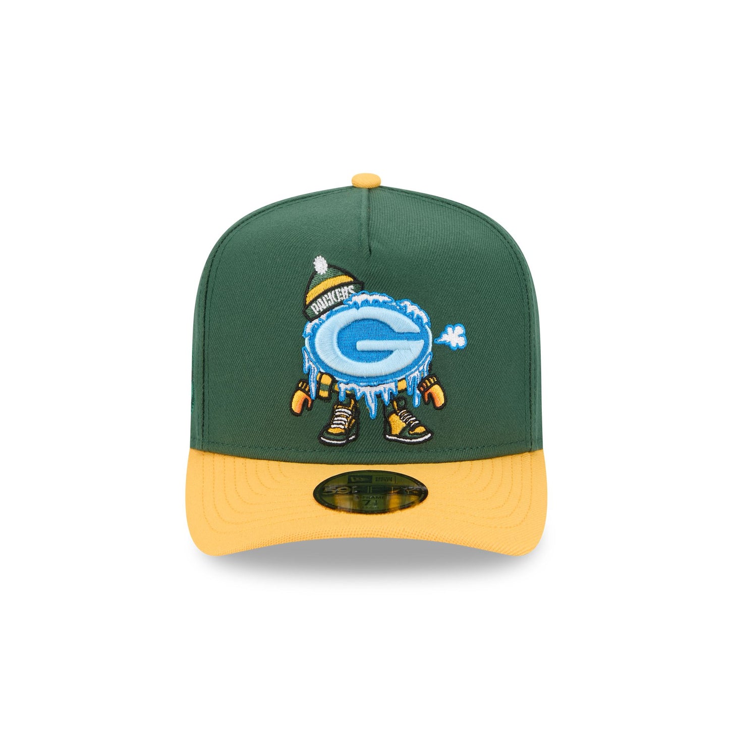 The Green Bay Packers Cartoon 59FIFTY A-Frame Fitted Cap features an embroidered Packers cartoon themed logo at the front with a matching NFL Shield at the rear, a monochromatic team logo at the right-wear side, and a gray undervisor.
