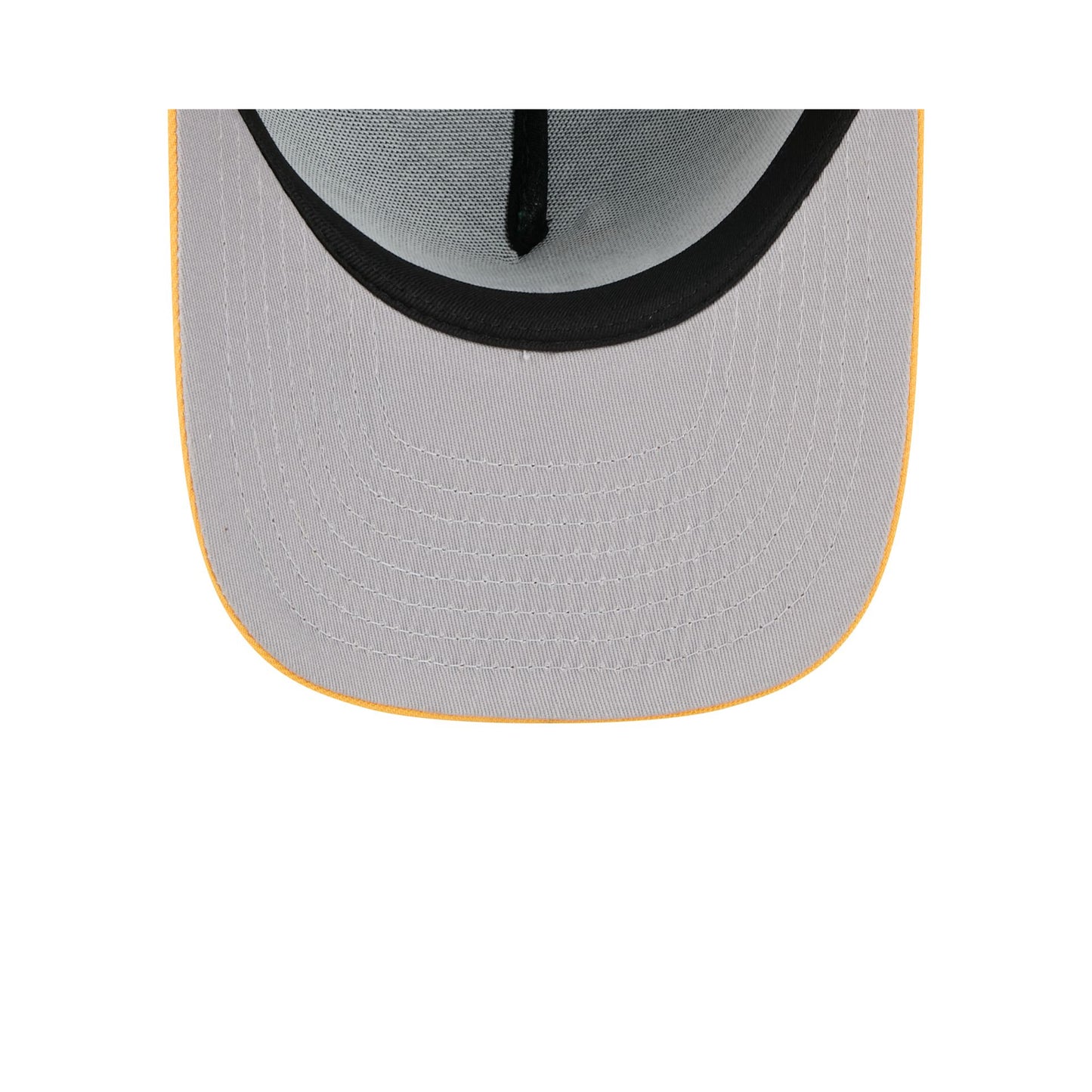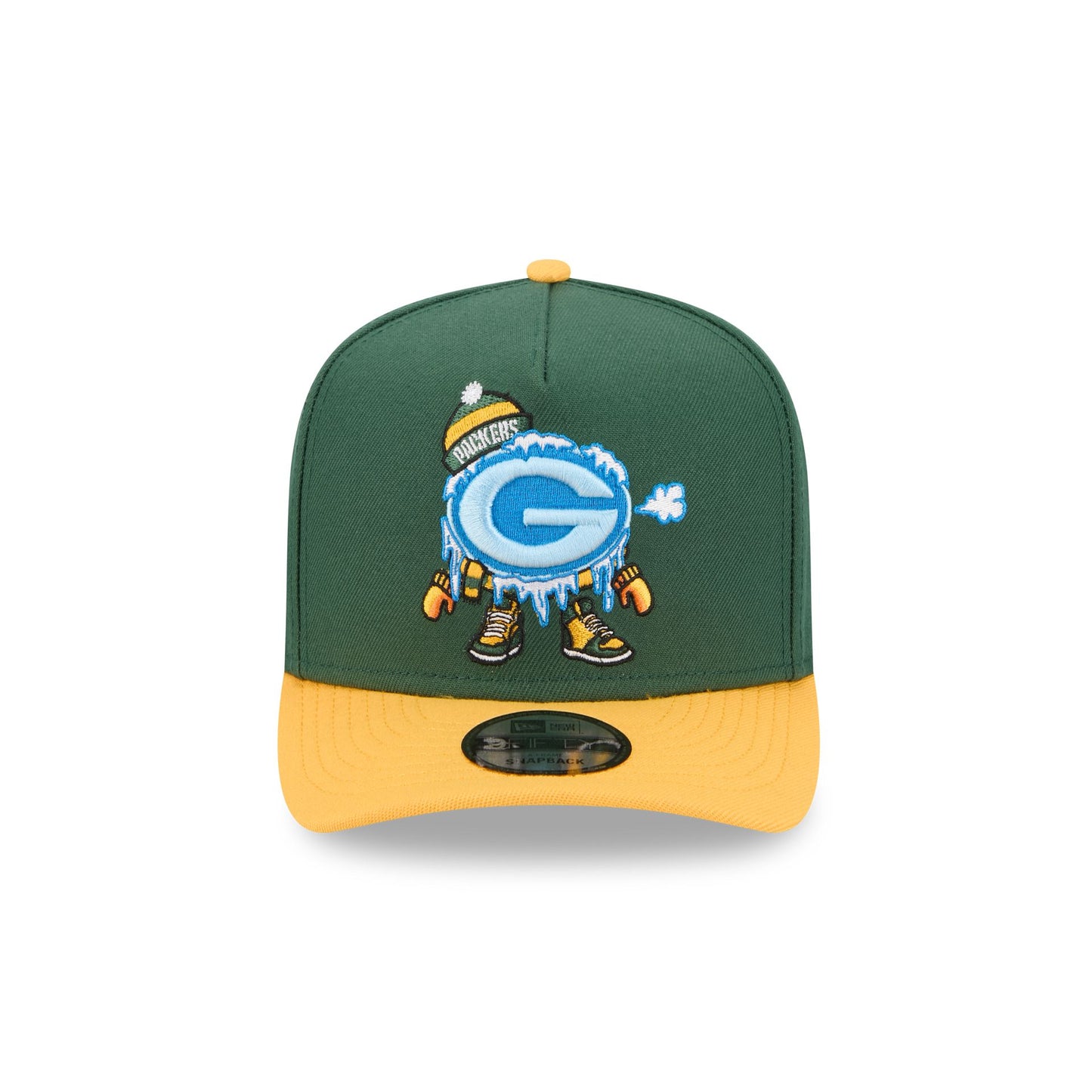 The Green Bay Packers Cartoon 9FIFTY A-Frame Snapback features an embroidered Packers cartoon themed logo at the front with a matching NFL Shield above a snapback closure at the rear. Additional details include a monochromatic embroidered team logo at the right-wear side and a gray undervisor.