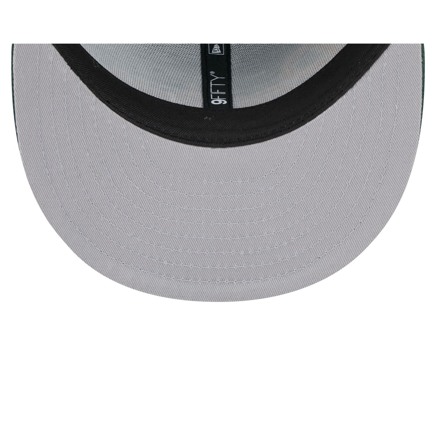 The Green Bay Packers Kids 9FIFTY Snapback Hat features an embroidered Packers wordmark at the front panels with a matching team logo at the right-wear side. Additional details include a gray undervisor and a snapback closure at the rear.